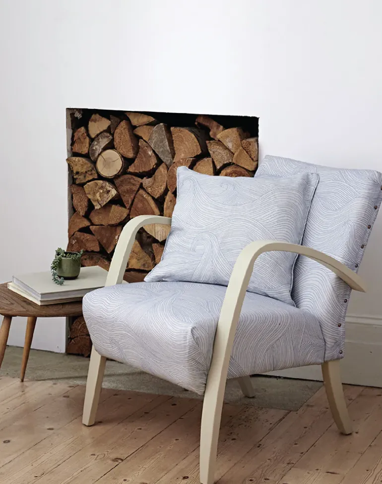 Seascape Winter is a black line drawing on white ground. The design is inspired by the rolling waves of a tempestuous sea designed to flow across your soft furnishings. Digitally printed in the UK on dew retted UK linen