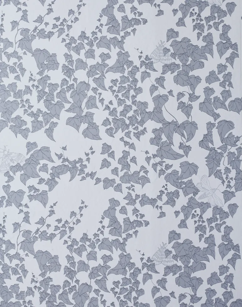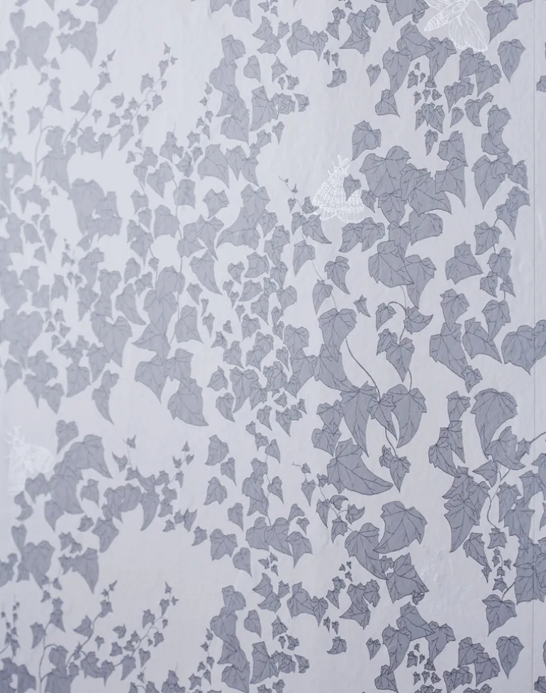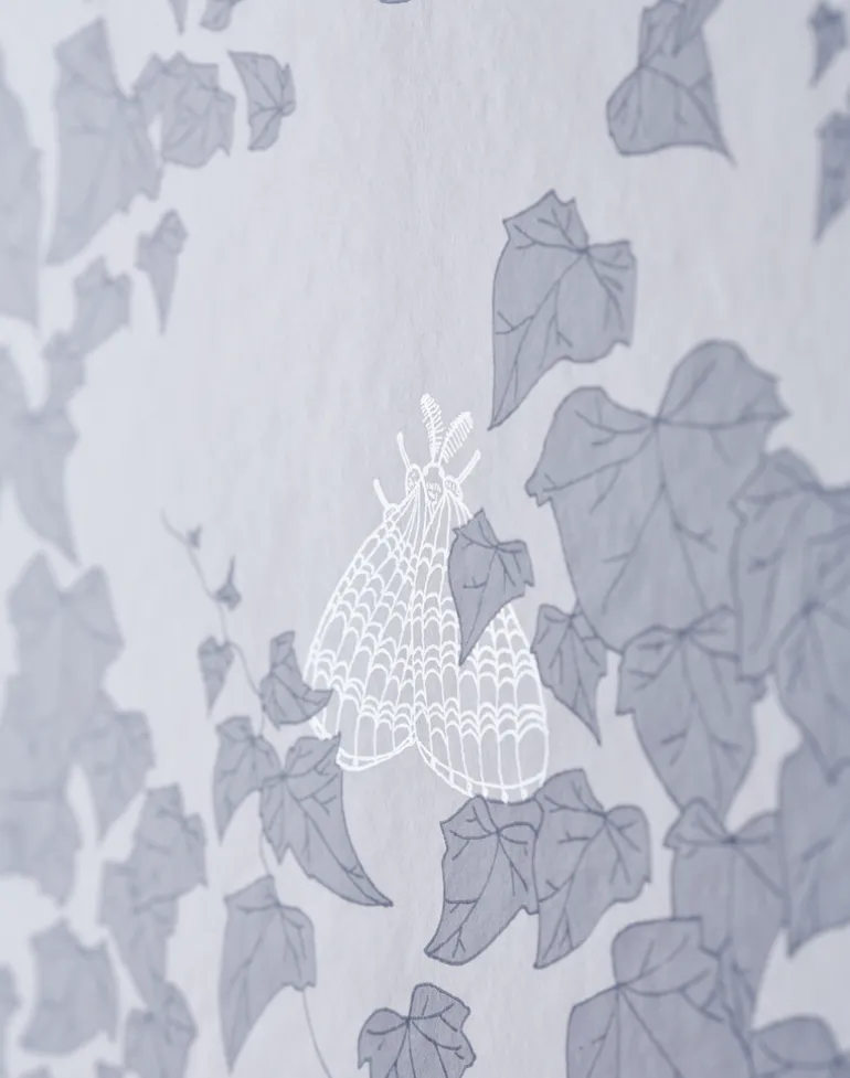 Inspired by the mystery of overgrown walled gardens and the 1909 novel, The Secret Garden; the calming, rambling design is hand drawn in pen. The tangled vines of ivy climb up the walls with golden metallic moths that become visible or hidden amongst the leaves depending on how the light hits the paper.