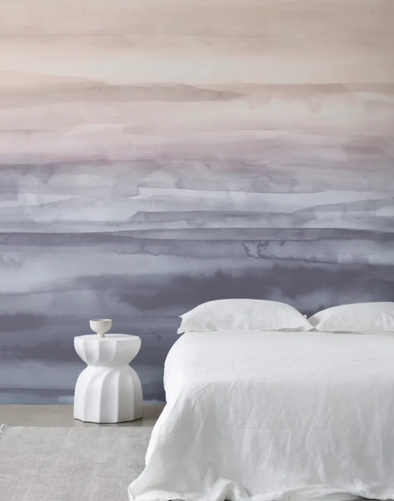 Layers of hand-painted watercolor flow across the paper, designed to bring restfulness to a room, adding a delicate and decorative touch.