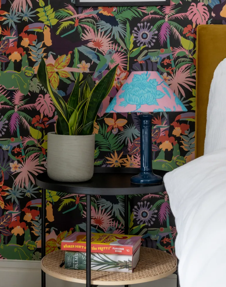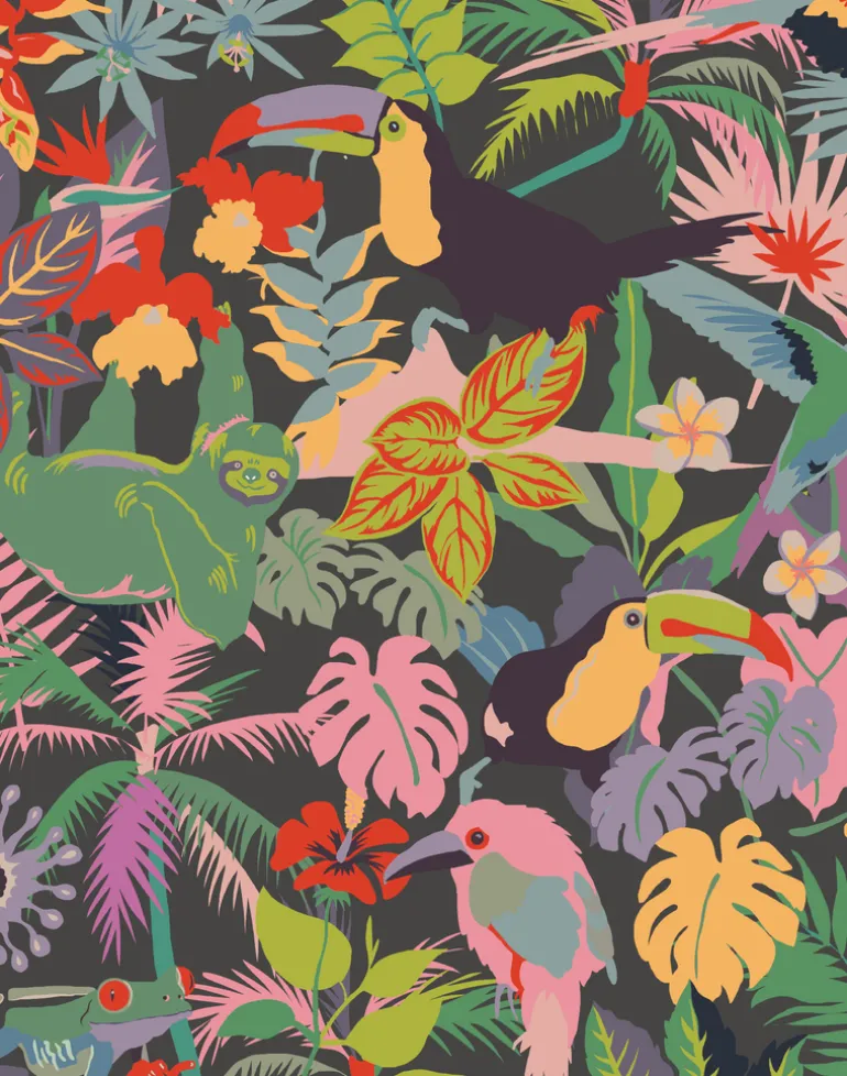 Selva Wallpaper in colorway Fiesta. Selva which translates to ‘Jungle’ in Spanish pays homage to the landscapes, foliage and fauna found in vibrant Costa Rica, where we conducted our inspiration for this seasons new prints . Featuring a handful of the native species including sloths, toucans and tree frogs hidden amongst the vast and thriving tropical foliage. This fun and vivacious print exudes the tropical and lush aura felt in the beautiful country of Costa Rica. The Fiesta colorway takes inspiration from the unique forests of Costa Rica and the beautiful bright colors of the vivid jungle landscape.