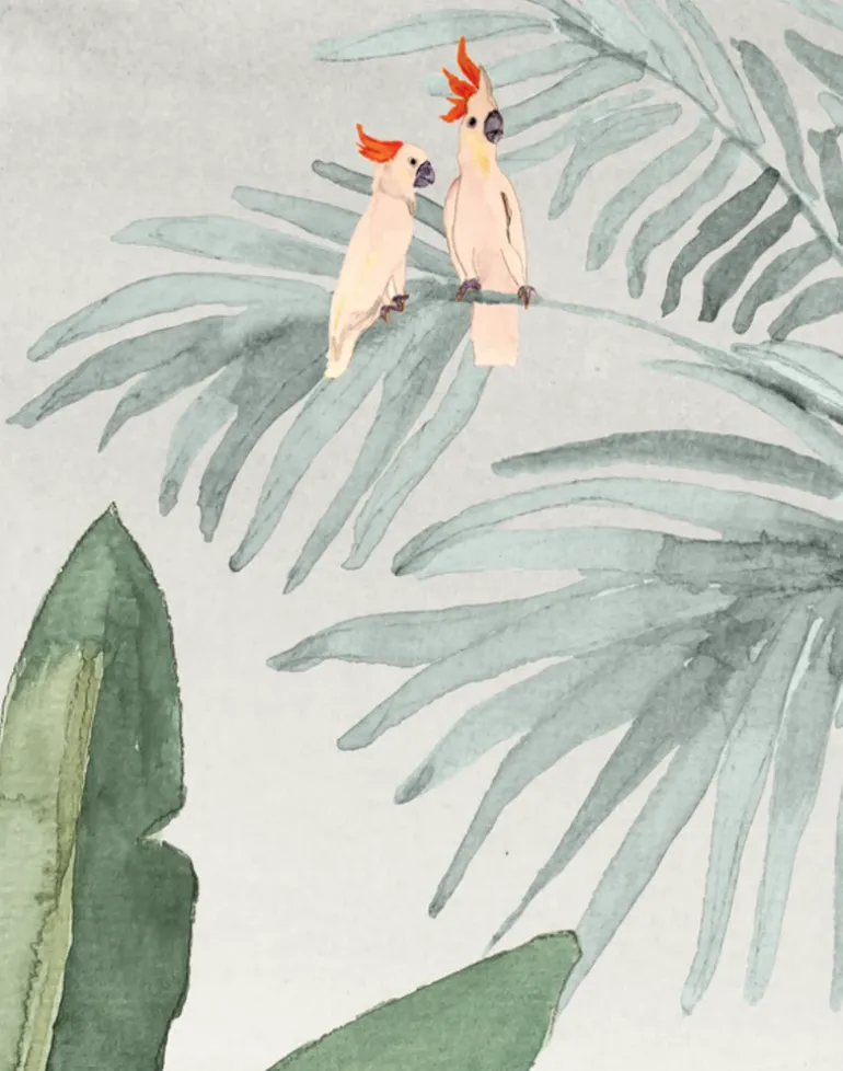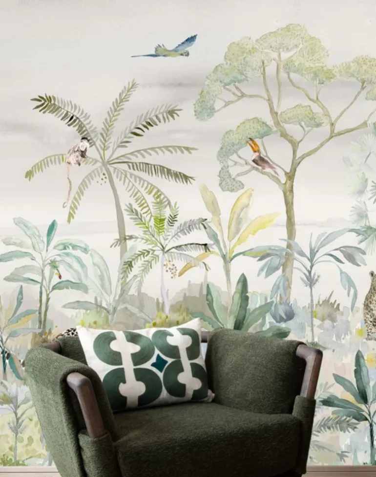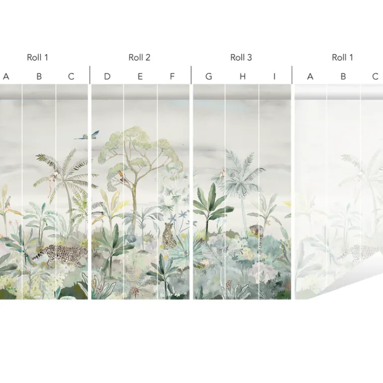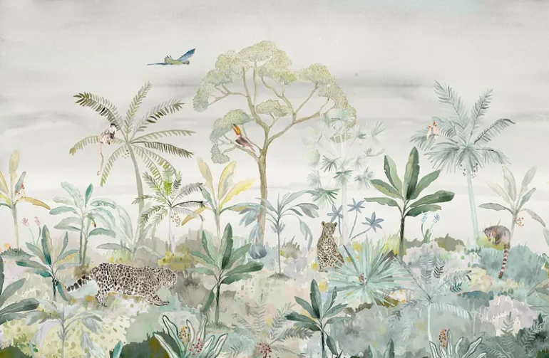 The panoramic wallpaper Selva transports us to the Jungles of Latin America, with its luxuriant fauna and flora. KARIOKAS’s emblematic animals play among colorful branches and flowers.