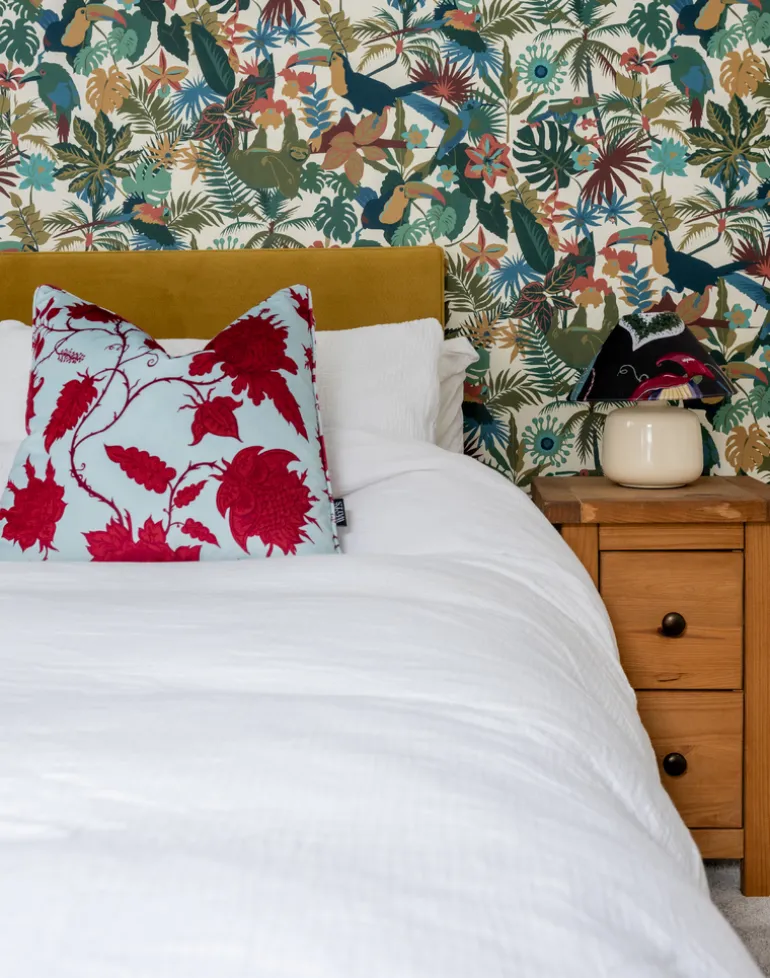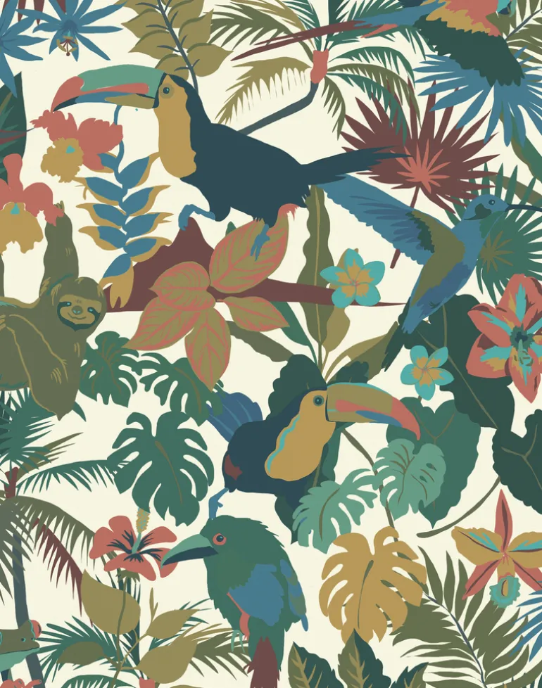Selva Wallpaper in colorway Peacock. Selva which translates to ‘Jungle’ in Spanish pays homage to the landscapes, foliage and fauna found in vibrant Costa Rica, where we conducted our inspiration for this seasons new prints . Featuring a handful of the native species including sloths, toucans and tree frogs hidden amongst the vast and thriving tropical foliage. This fun and vivacious print exudes the tropical and lush aura felt in the beautiful country of Costa Rica. The Peacock colorway is inspired by the magnificent jewel like tones of this majestic bird. Native to India and Sri Lanka these stunning birds are undeniably one of the most impressive and beautiful birds on the planet with their remarkable display of iridescent blues, greens golds and oranges.