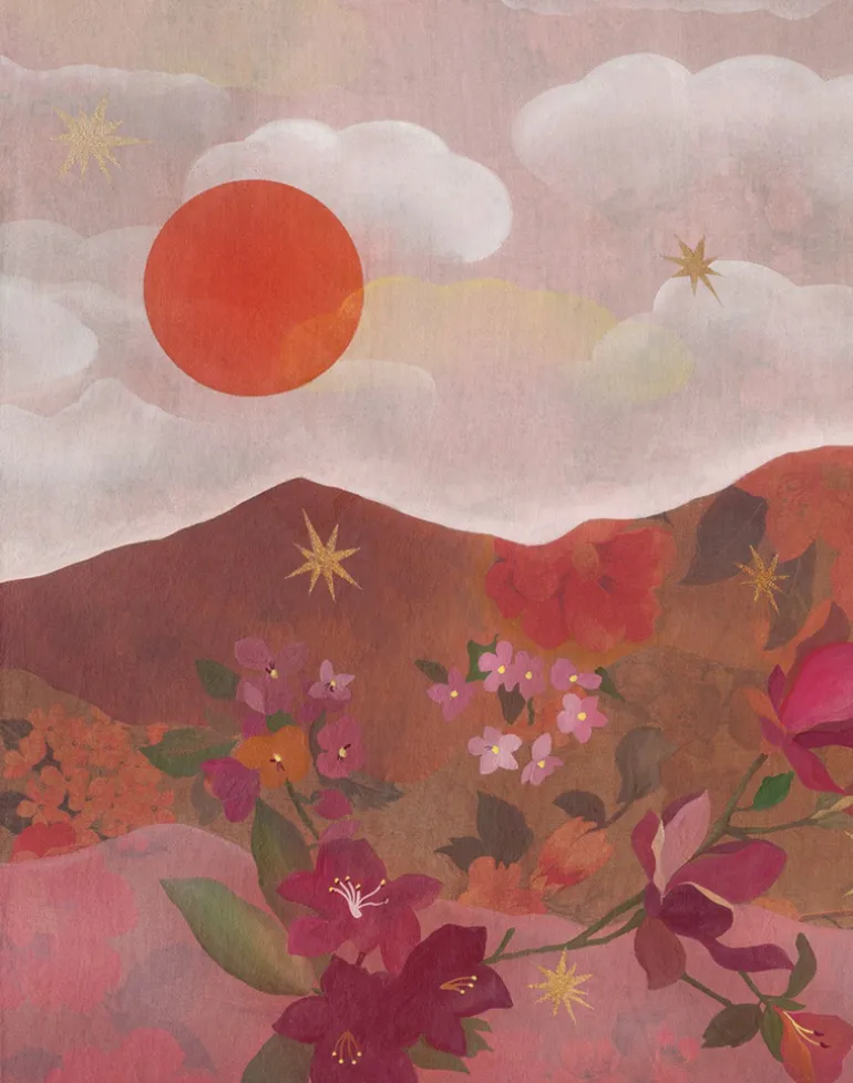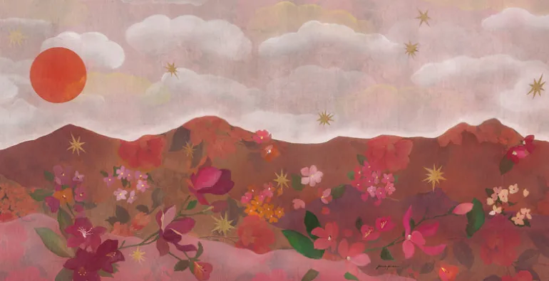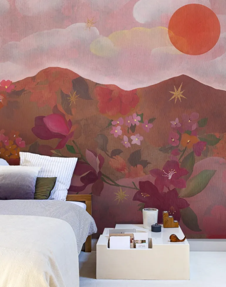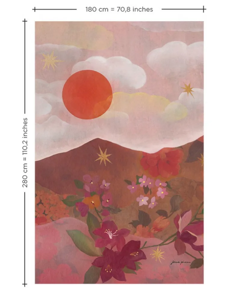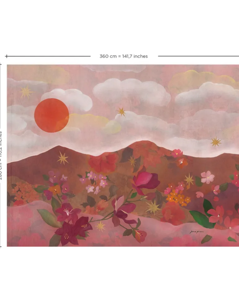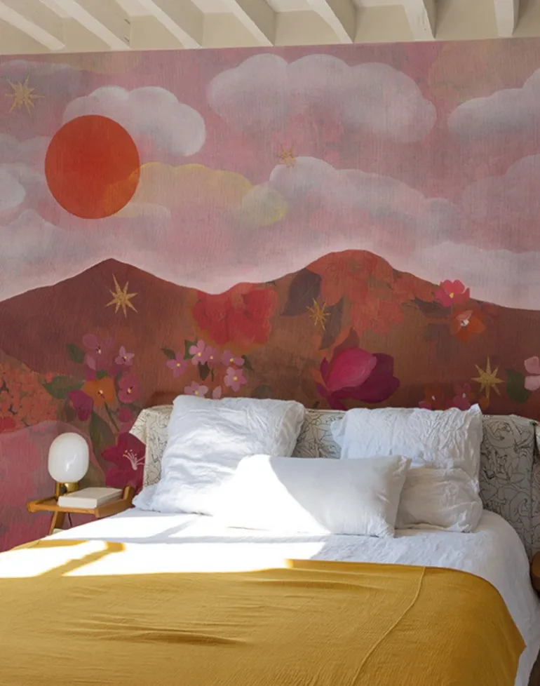 This panoramic decor, originally painted by French artist Jenne Pineau, is all about stars and flowers. The warm hues of intense pigments summons a vibrant horizon and the hills are alive with the sweet perfume of flowers. Let the sun shine in…