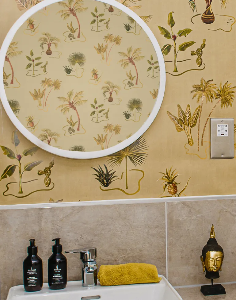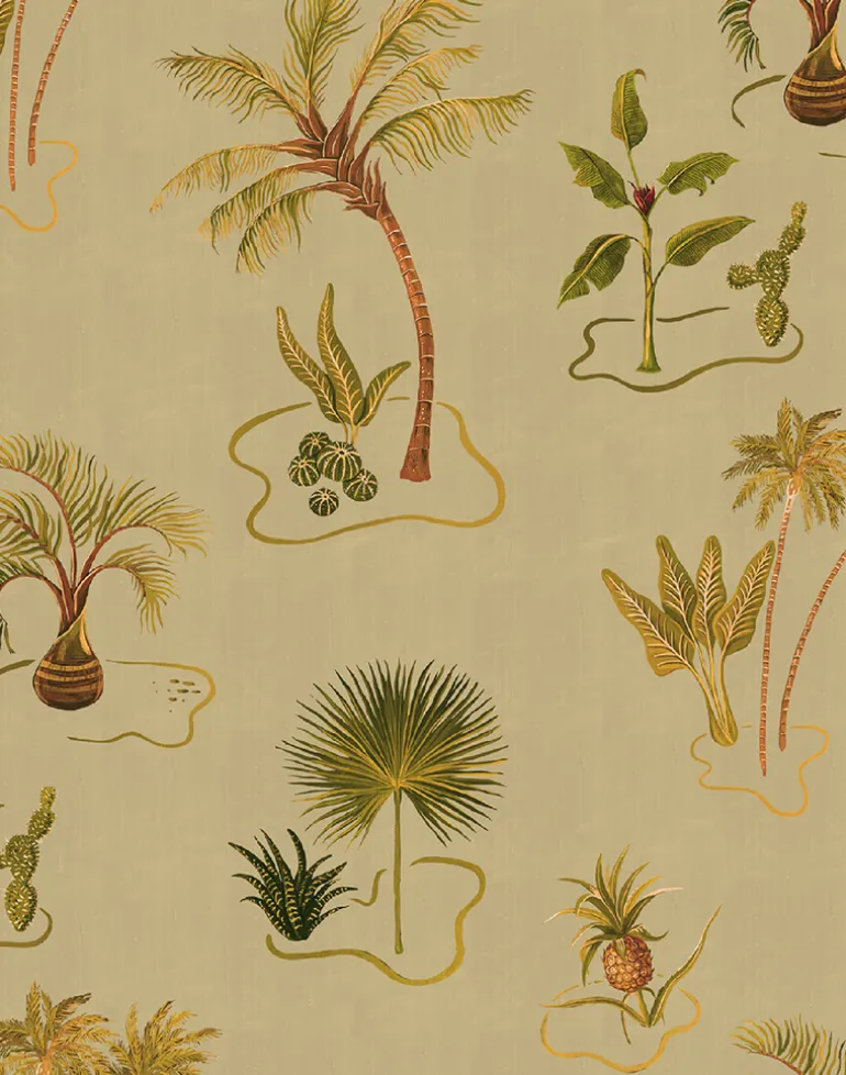 Solitude Wallpaper in Soft-Sand. Solitude is reminiscent of days on a warm beach, soft breeze, good book, it aims to transport you to a happy place of peace and serenity. Solitude is in soft caramel and tropical sandy tones with an array of tropical palms dipped in that golden sunset hour glow. This print gives us serious Bali beach house vibes. Pair with dried palm and Pampas grass for the full look.