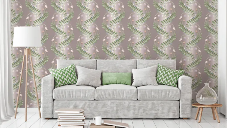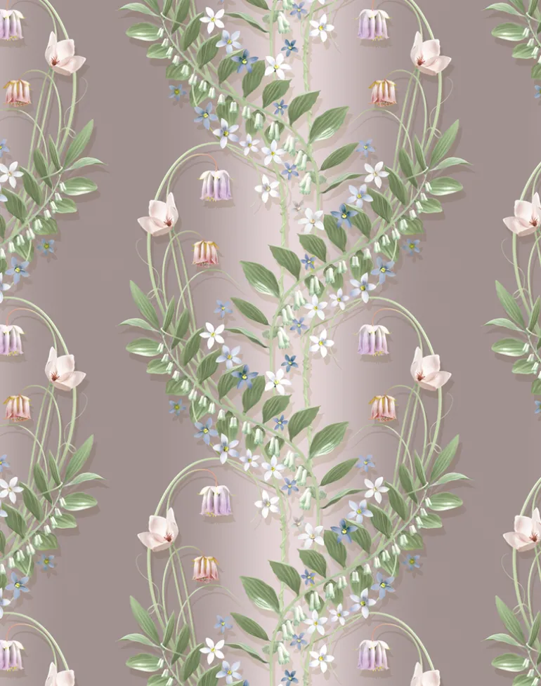 There is one vertical stripe of flowers with flat color on either side of each 52 cm wide roll, so this wallcovering can be hung in any style, be it half drop or block repeat depending on your preference. See other roomsets of others colors in the range to see how this looks.