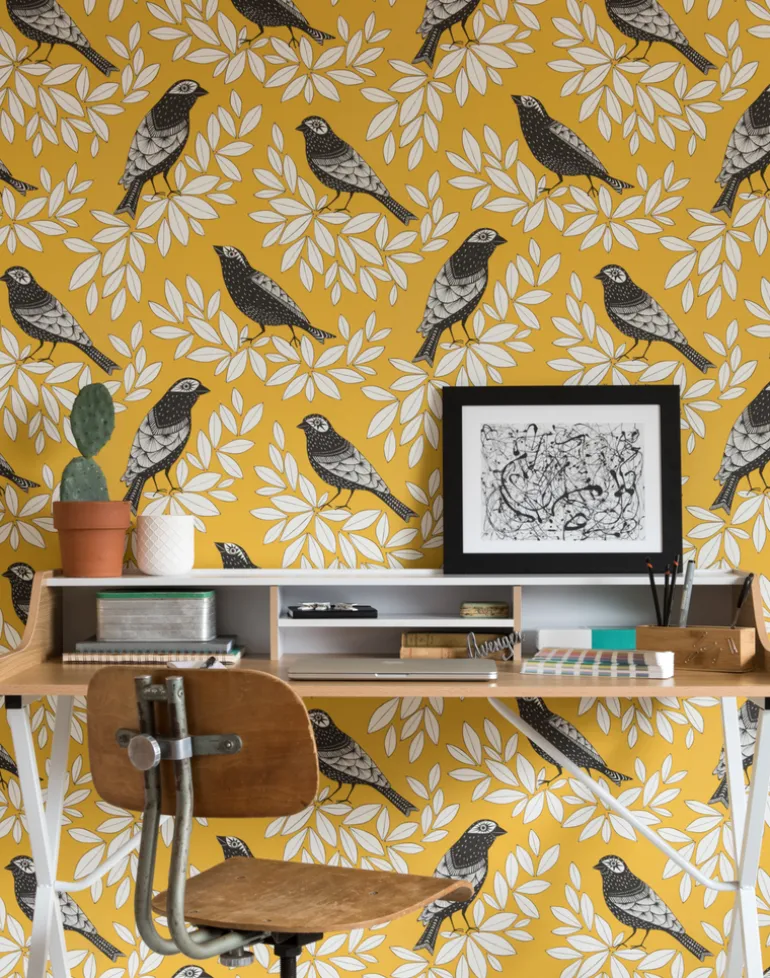 A whimsical design featuring hand drawn songbirds nestling among sprigs of leaves. All MissPrint designs are originally drawn by hand and developed in their own studio.