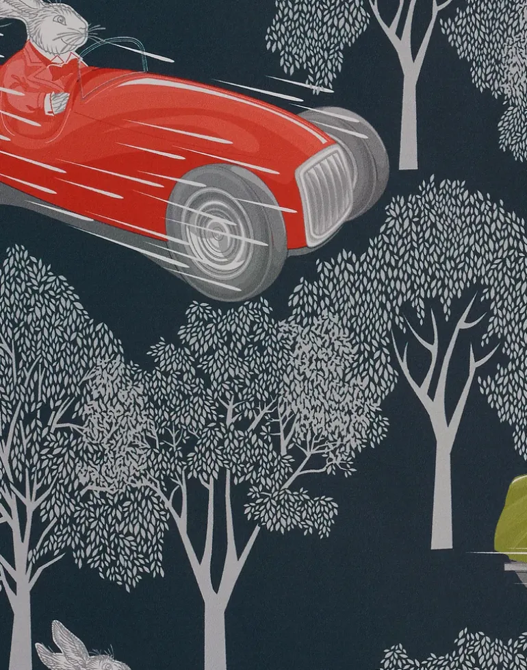 Cute bunnies with the need for speed racing across the walls in Midnight Blue.