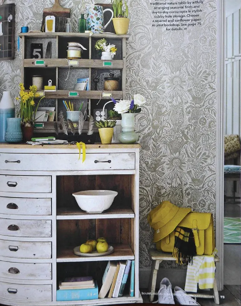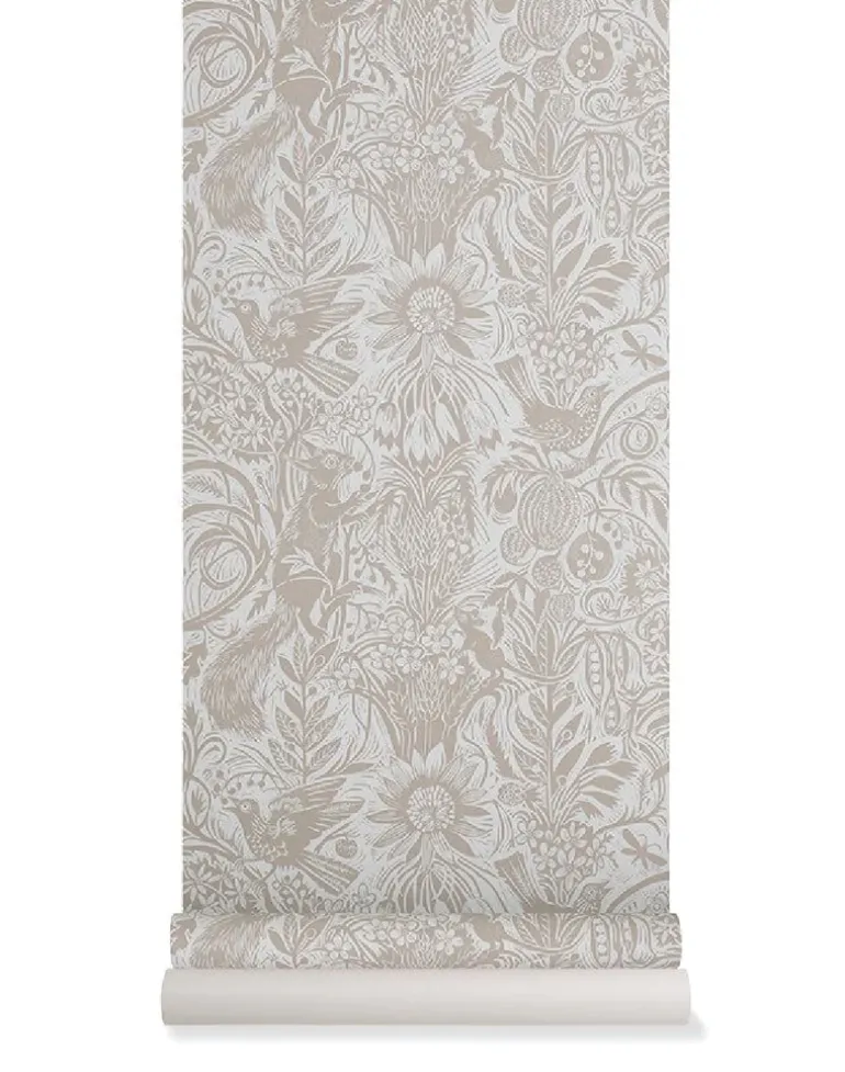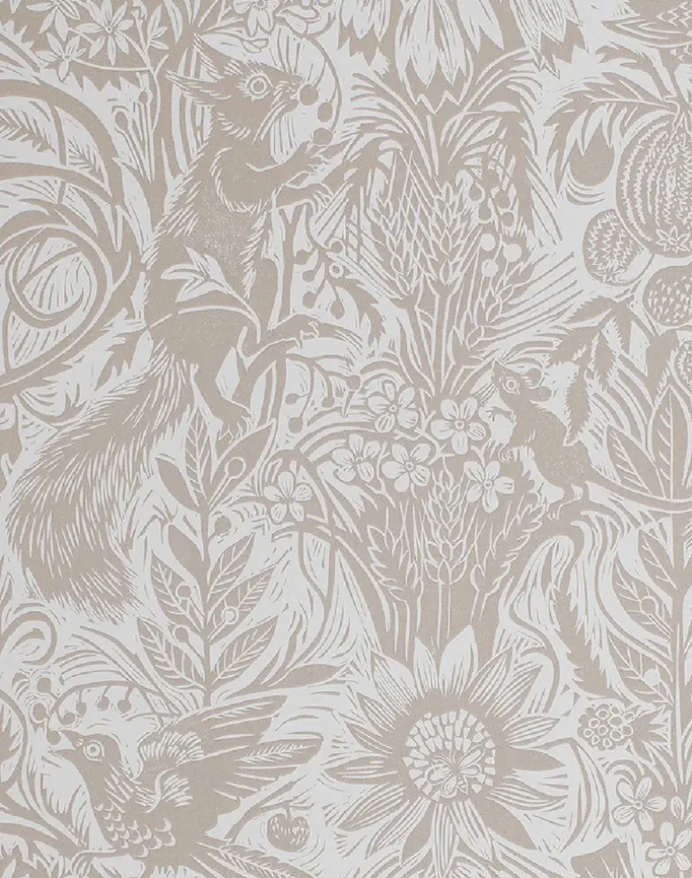Squirrel and Sunflower by Mark Hearld is a single color wallpaper, printed in the UK using water-based inks and paper from sustained forests. This design originates from an original lino-cut by Mark Hearld and as with many St. Jude’s designs the texture of these hand printed elements may well be reflected in this wallpaper.