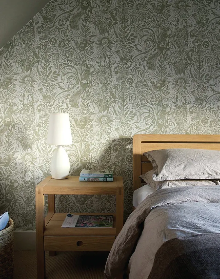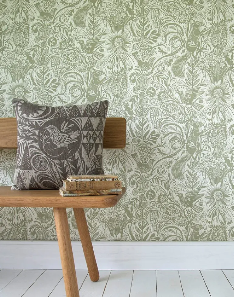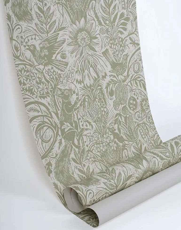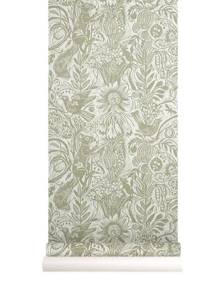 Squirrel and Sunflower by Mark Hearld is a single color wallpaper, printed in the UK using water-based inks and paper from sustained forests. This design originates from an original lino-cut by Mark Hearld and as with many St. Jude’s designs the texture of these hand printed elements may well be reflected in this wallpaper.