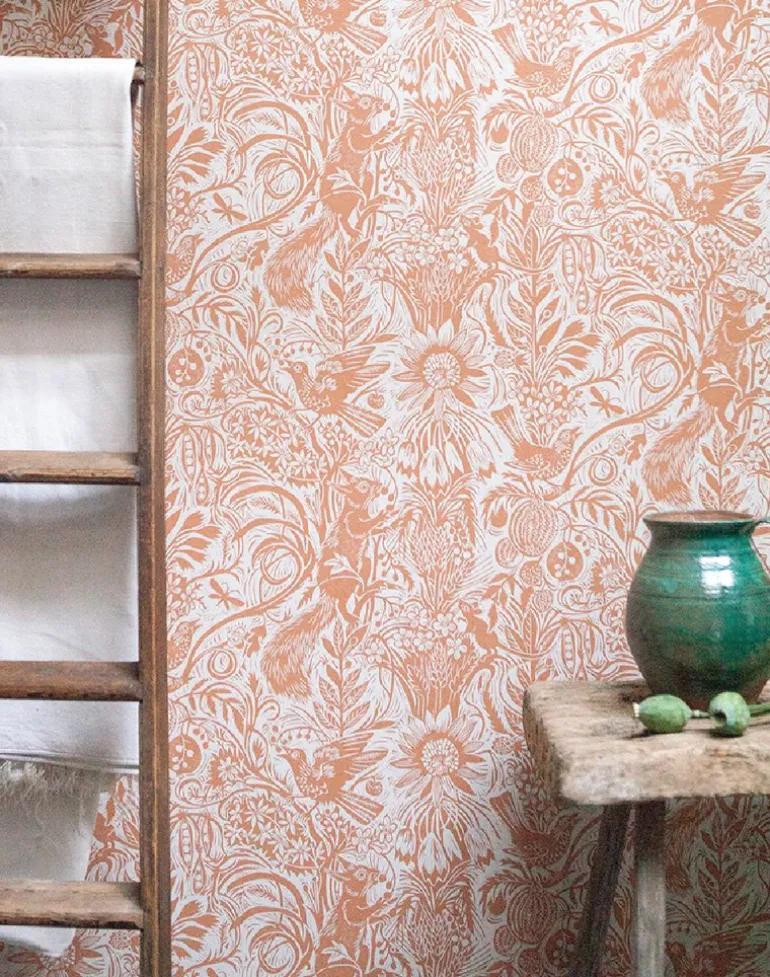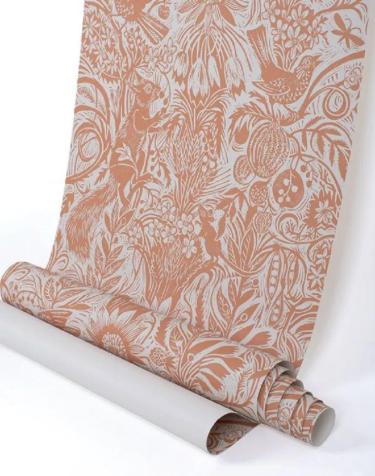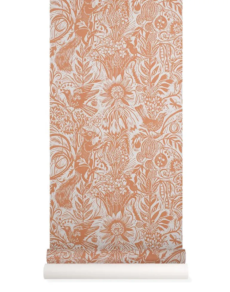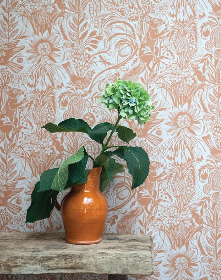 Squirrel and Sunflower by Mark Hearld is a single color wallpaper, printed in the UK using water-based inks and paper from sustained forests. This design originates from an original lino-cut by Mark Hearld and as with many St. Jude’s designs the texture of these hand printed elements may well be reflected in this wallpaper.