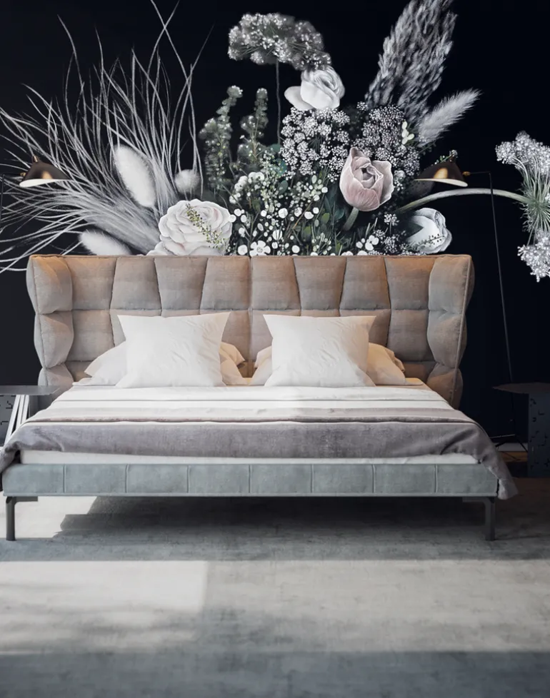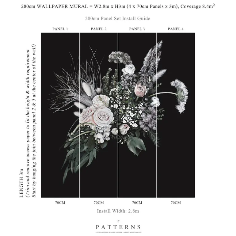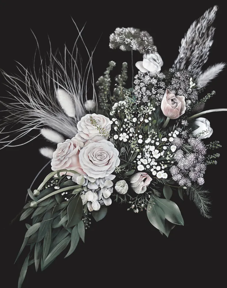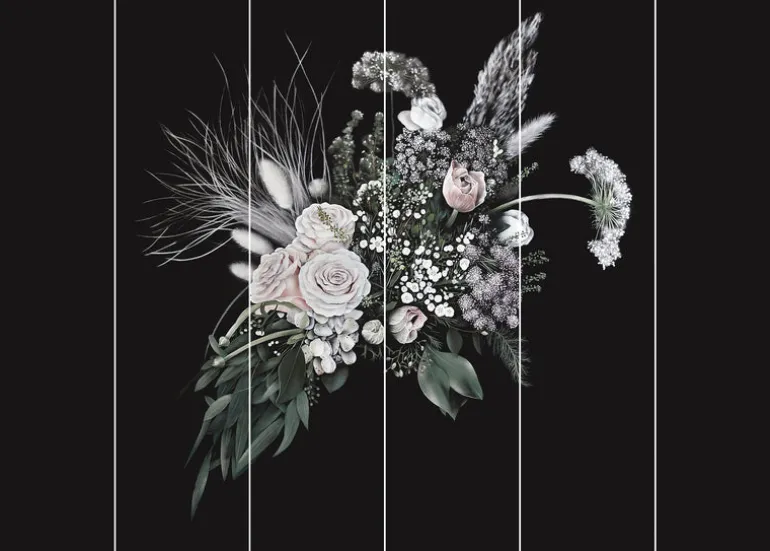 Developed by a creative British quartet under the guidance of experimental interiors house 17 Patterns. St Margaret’s Rose is a sophisticated hand-painted floral wallcovering of grand proportion. Printed on a traditional fibrous parchment; dramatic dark hues, pastel rose petals, and ethereal grasses depict a bouquet of inspiring beauty. Fashioning an air of romance from delicately sprayed textures, tonal nuance and fingered minutiae, British Photorealist Jason Busk displays technical mastery of his art medium; the aerosol can. Meticulous in his delivery, Busk interprets the uncontrived decorous flora of artisan florist Thistle and Pearl, by referencing the high definition photography of project lensman Ben Peter Catchpole. Conceptualized and orchestrated by avant-garde wallpaper designer Nosca Inc, this playful 21st century ‘Still Life’ delivers an ensemble of artistic styles that crescendo into a spectacular interior mural.