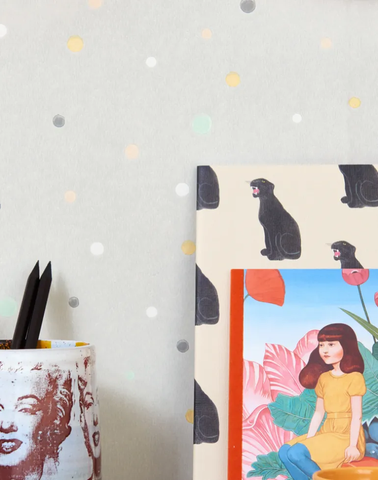Pale yellow, green, peach, and charcoal illustration on grey background