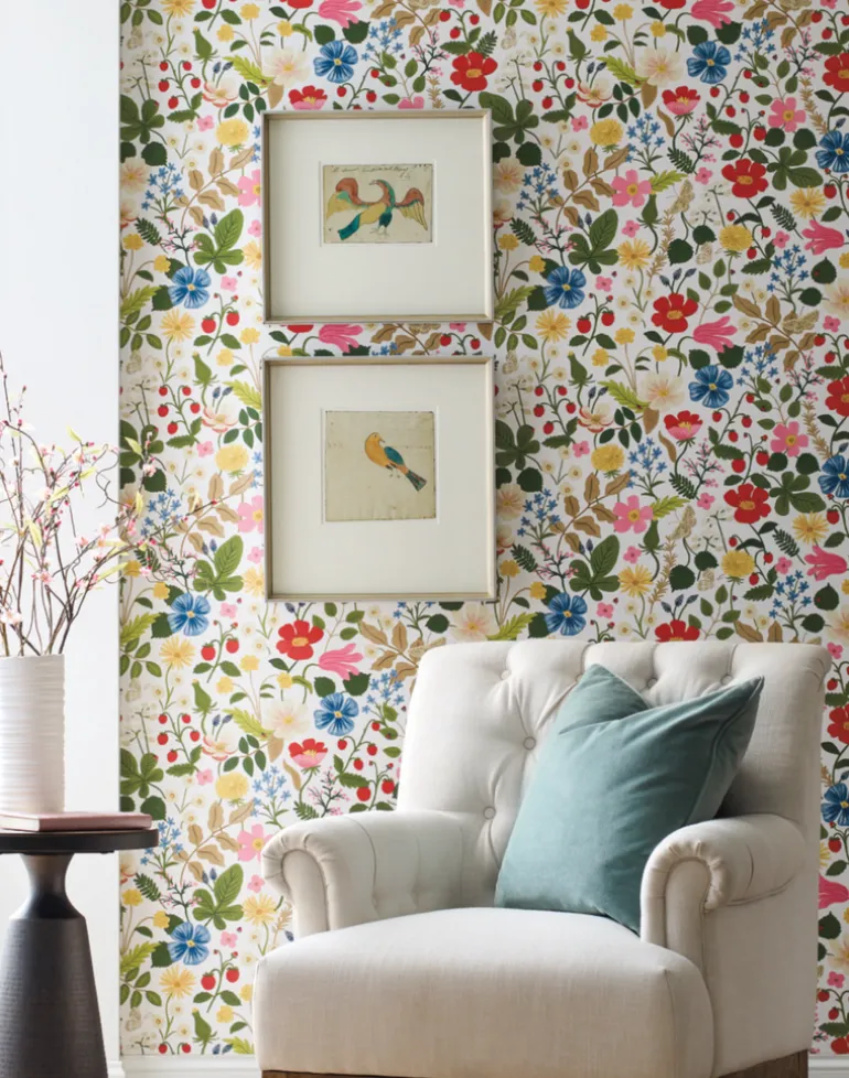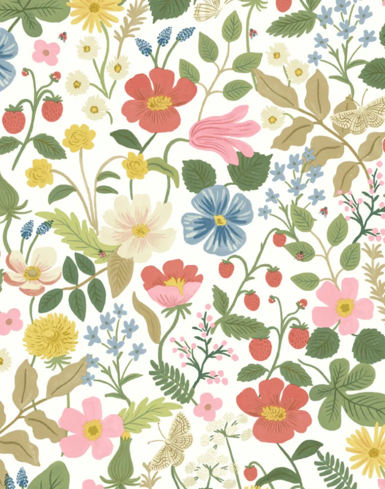 The bright blooms, trailing leaves, and sweet berries of Strawberry Fields create a pattern that will bring cheer to any space, and the occasional fluttering butterfly adds a whimsical accent. This wallpaper is gravure printed and comes in 27 inch rolls with a 24 inch repeat.