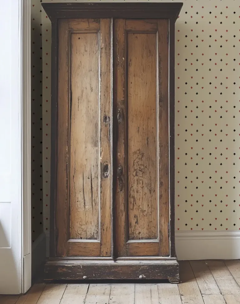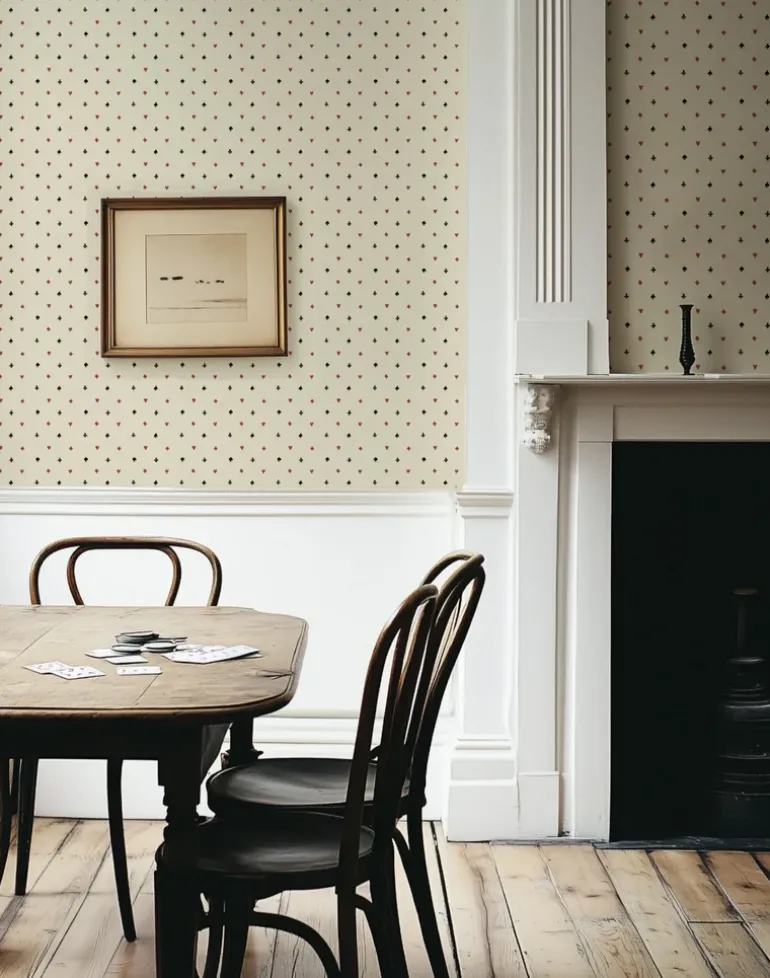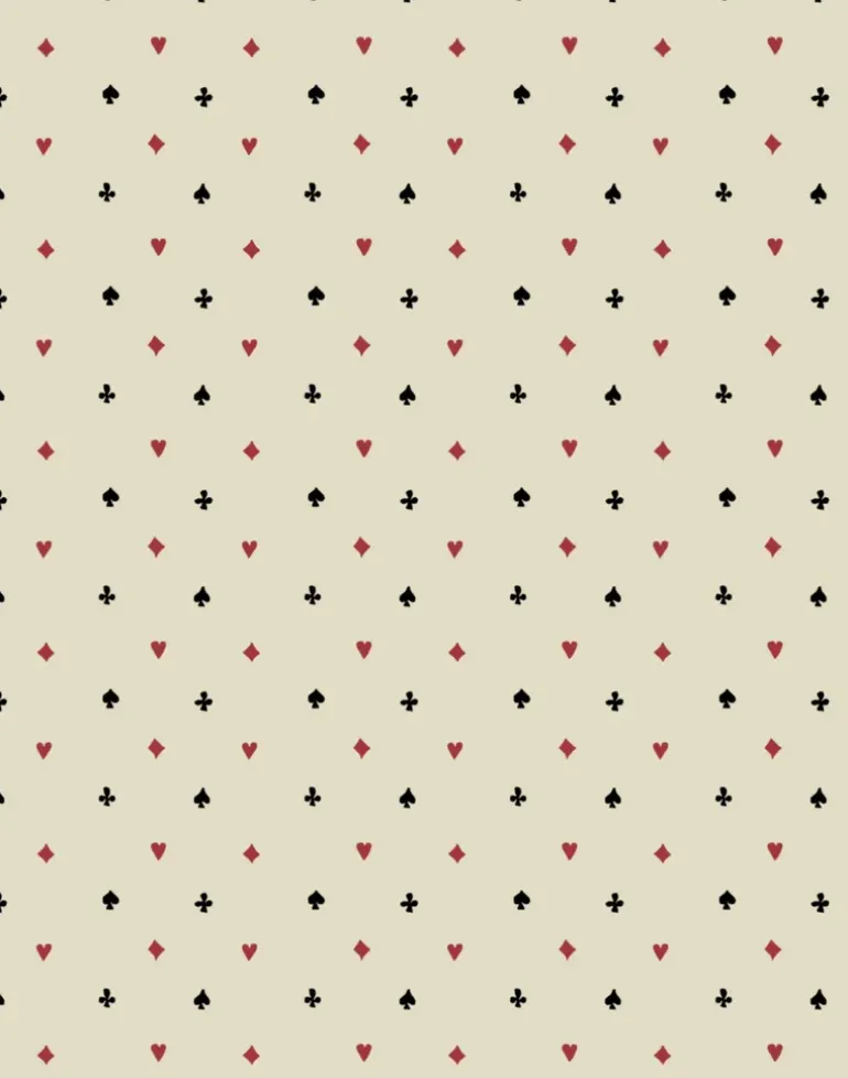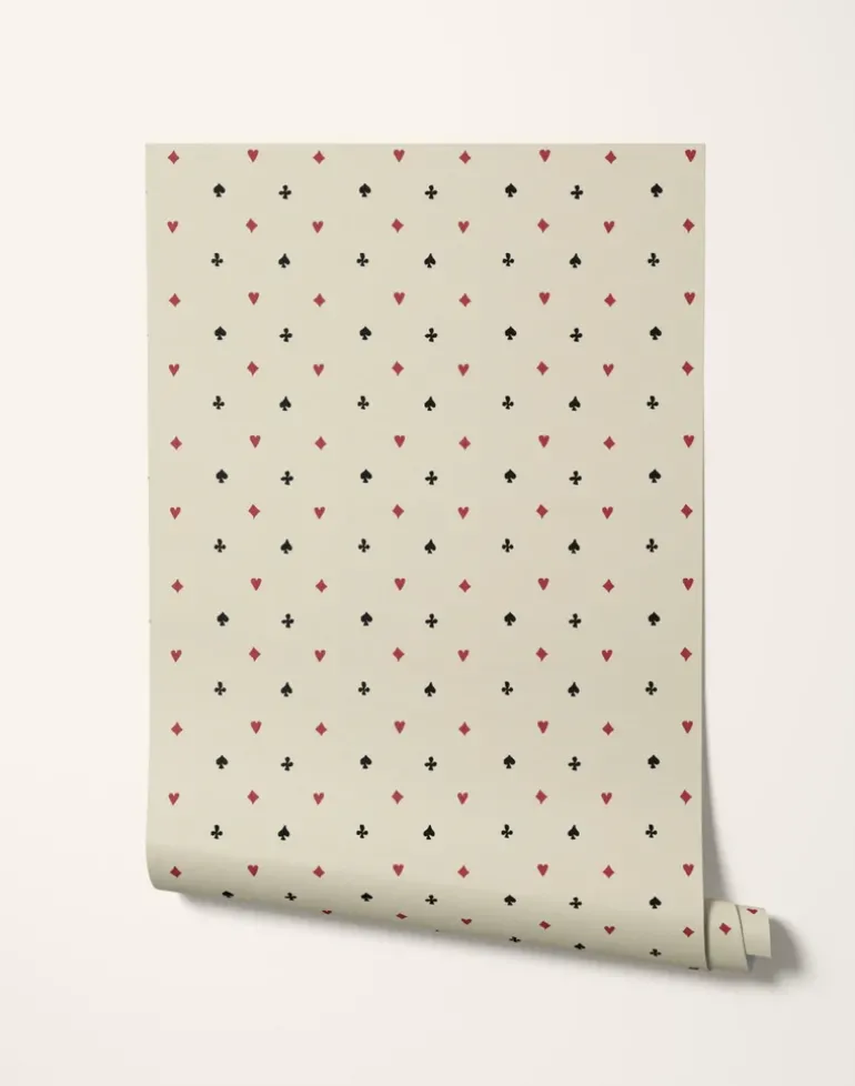 Suits You is a wallpaper that combines nostalgic charm with a playful twist. From a distance, its earthy tones offer a sophisticated, vintage feel. Up close, the design reveals a joyful tribute to card games, with hearts, diamonds, spades, and clubs playfully dancing across the surface.