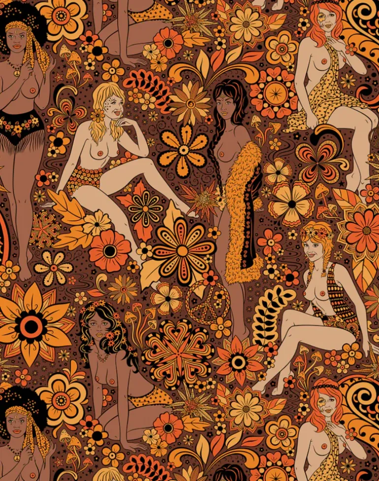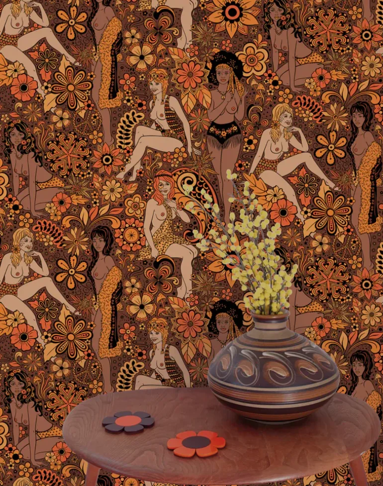 San Francisco, 1967: The Summer of Love! Dupenny’s labyrinthine design reveals seductive “flower children” frolicking within a psychedelic botanical nirvana. This design was inspired by an original wallpaper from the 1960s and offers a novel twist on the kitsch Flower Power patterns of the past.