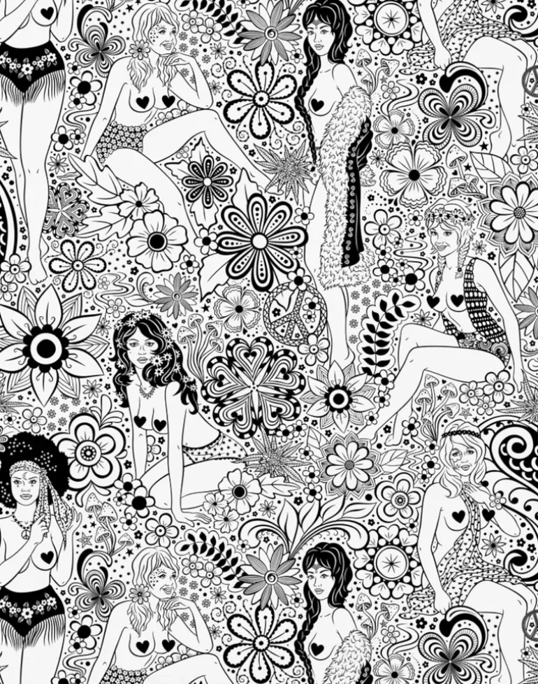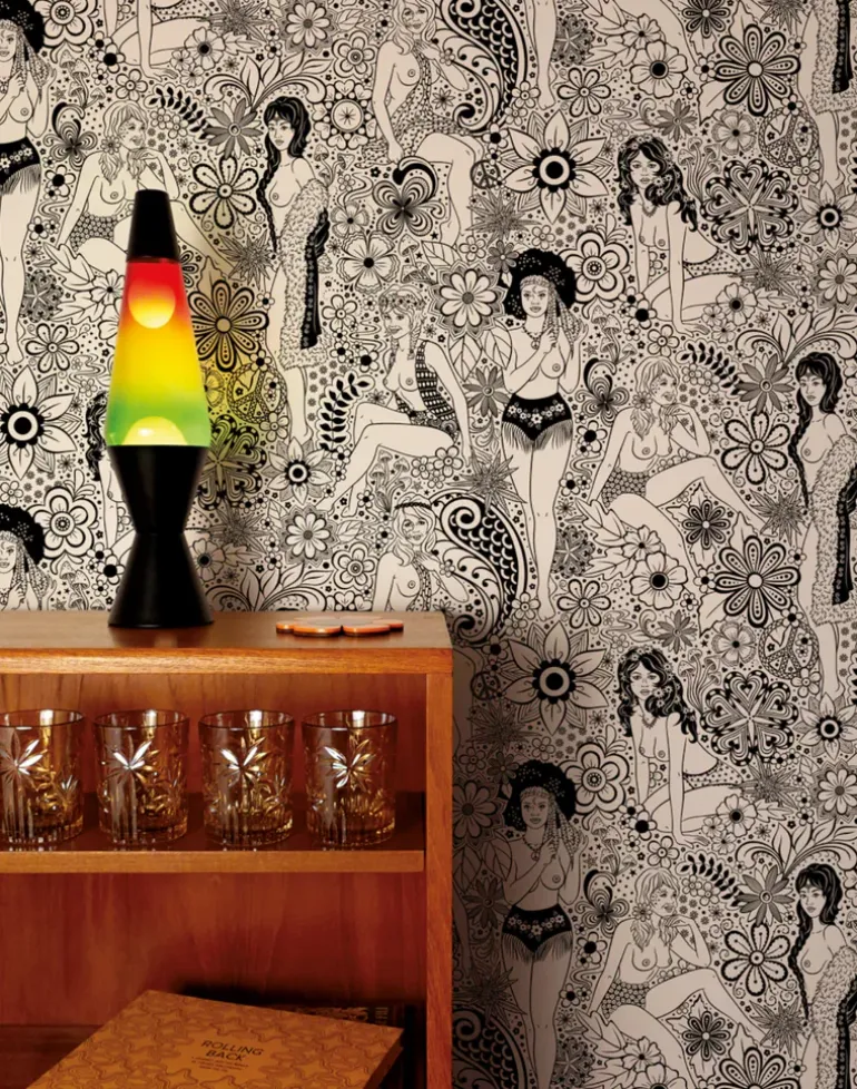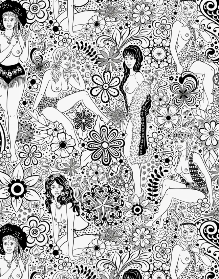 San Francisco, 1967: The Summer of Love! Dupenny’s labyrinthine design reveals seductive “flower children” frolicking within a psychedelic botanical nirvana. This design was inspired by an original wallpaper from the 1960s and offers a novel twist on the kitsch Flower Power patterns of the past.