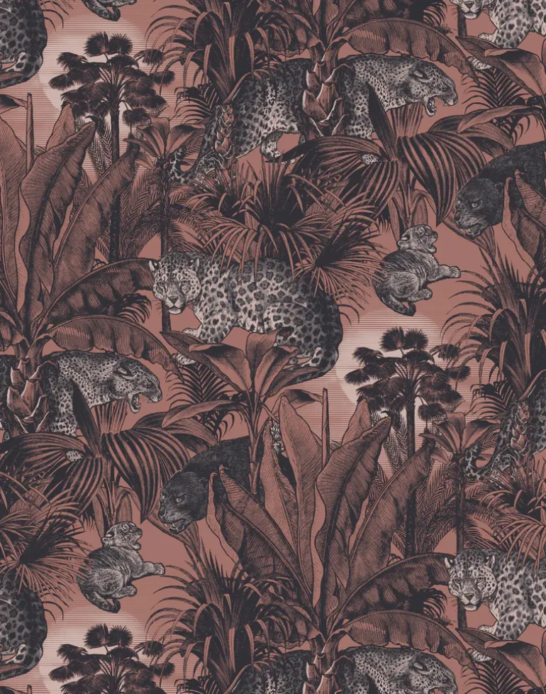 Our iconic print featuring tropical palms, jungle foliage and big cats. FAUNACATION combines a bold colour palette of rich blues and reds for a fabulous finish whether it’s for a bold feature wall or a complete room.
