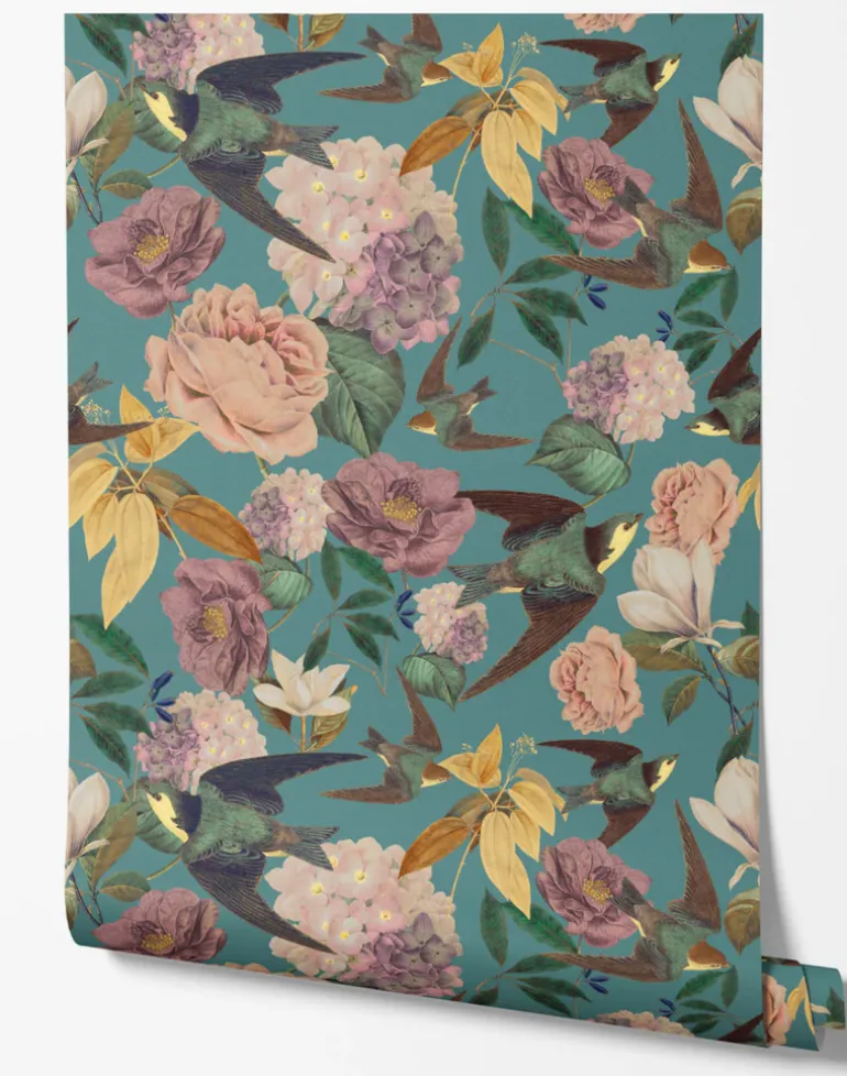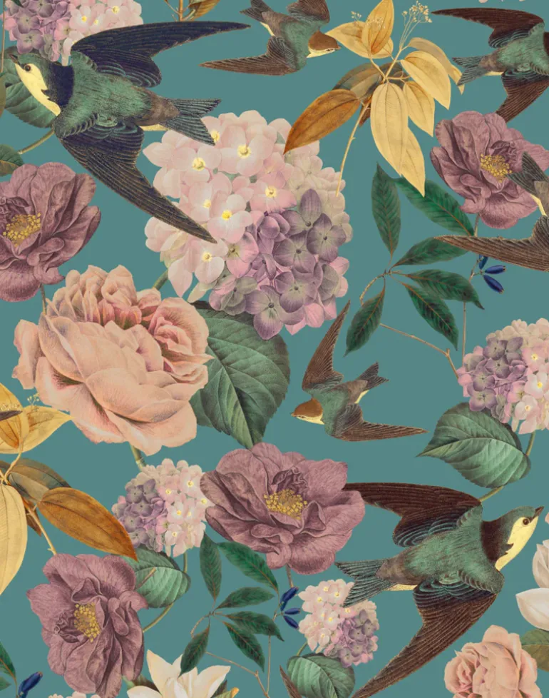 Swallows and Blooms beautifully blends graceful swallows with exquisite floral motifs. Deep blue-green swallows with hints of yellow bring movement and lightness, while soft pink roses and dreamy hydrangeas add a touch of romance. With intricate detailing and nature-inspired elements, this design captures the whimsical spirit of Rococo and brings dynamic luxury to any space. Perfect for adding timeless charm, “Swallows and Blooms” embodies the beauty of nature with a sense of opulence.