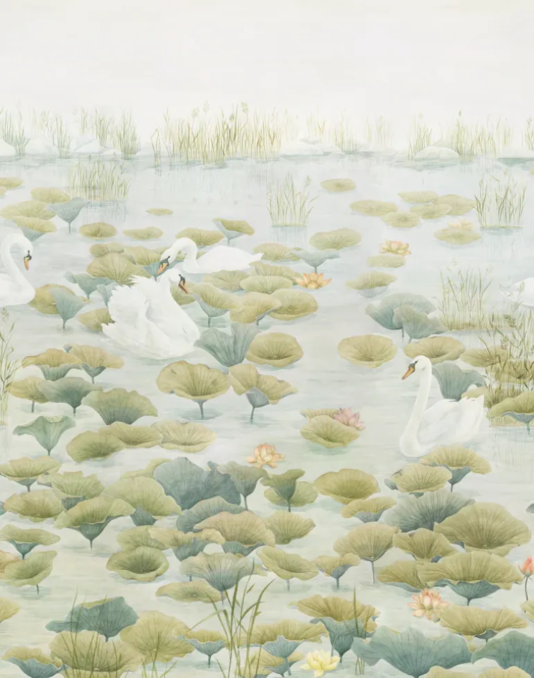 Inspired by the elegance and grace of Tchaikovsky’s ballet, Sian Zeng’s Swan Lake collection is an enchanting mural wallpaper depicting a group of swans amongst the lilies. Available also in Pink