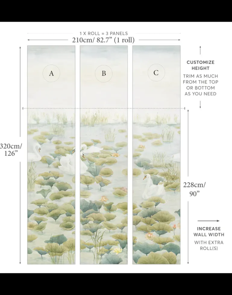 Customize the height of your mural by trimming as much of the white top end of the wallpaper panels as you need to. To increase the width of your wallpaper, please purchase an extra roll. See our diagrams for reference.