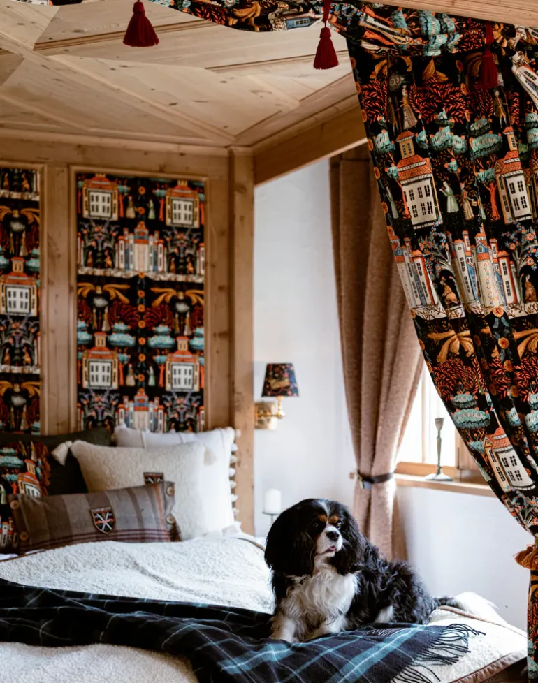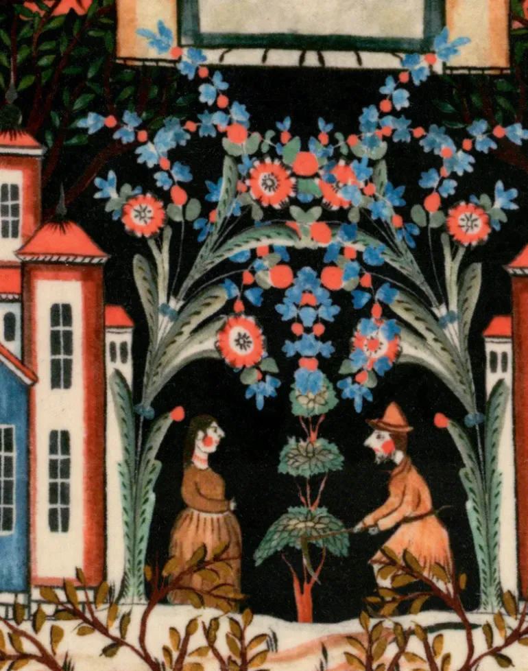 Step into a world of wonder with TALES OF TYROL, a magical design where Tyrolean architecture and village folk come together under a canopy of fantastical foliage. Rosy cheeked in their traditional costumes, these charming characters inhabit an imaginary town surrounded by trees and flowers in a host of jewel-like shades.