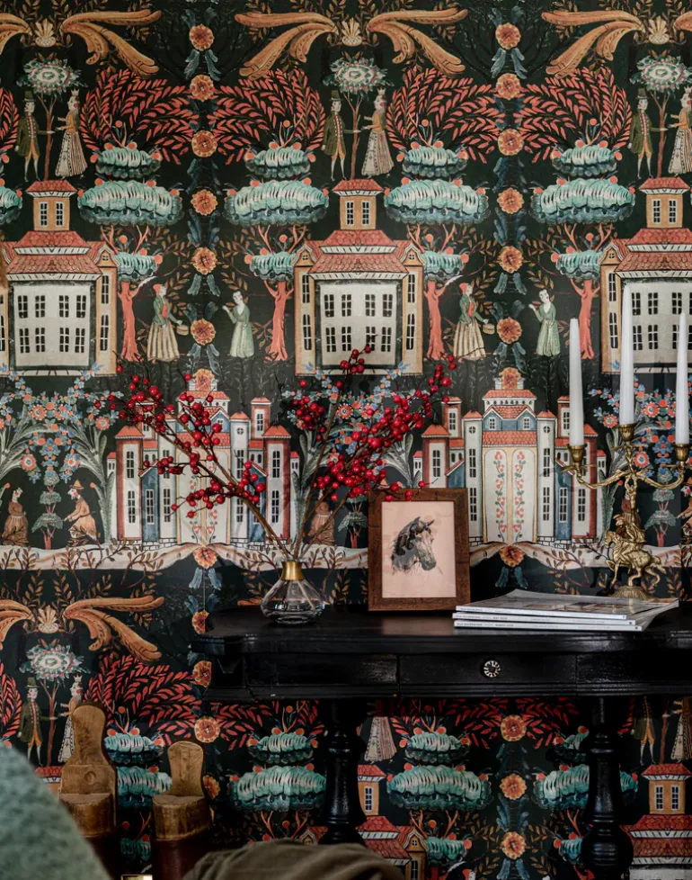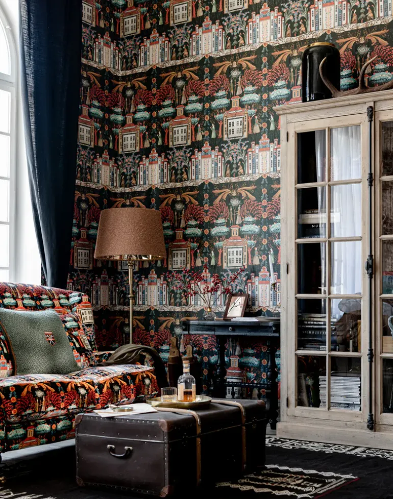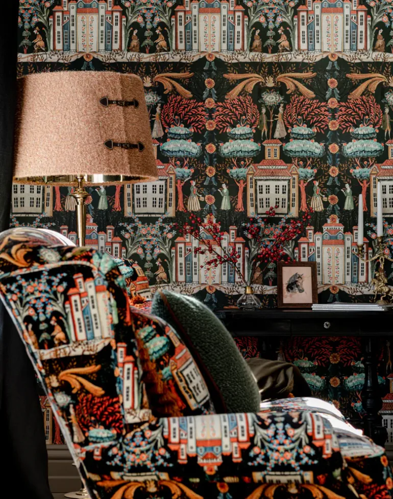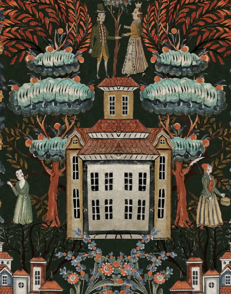Step into a world of wonder with TALES OF TYROL, a magical design where Tyrolean architecture and village folk come together under a canopy of fantastical foliage. Rosy cheeked in their traditional costumes, these charming characters inhabit an imaginary town surrounded by trees and flowers in a host of jewel-like shades.