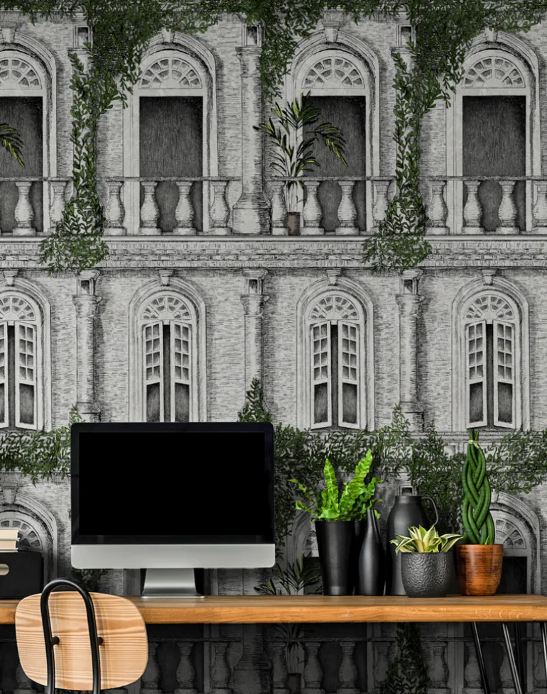 An amazing hand sketched drawing, demonstrating beautiful detail surrounding the doors and the windows of this architectural building with the growing foliage adding to the aura and stunning design created by Brand McKenzie.
