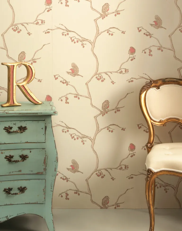 Our take on the quintessentially English bird is prettily pink breasted and flitting between softly metalicised branches.