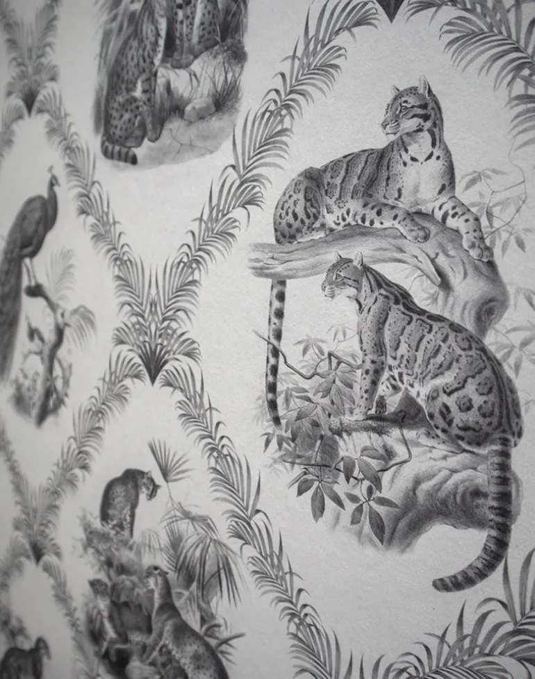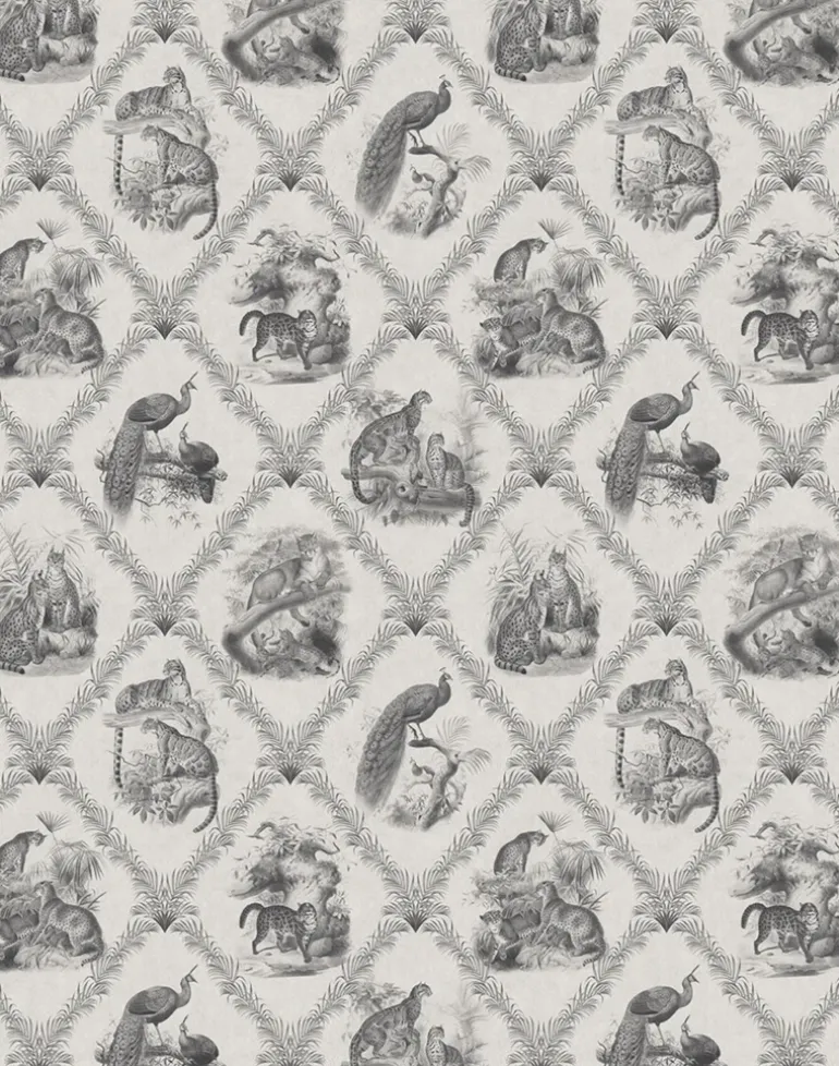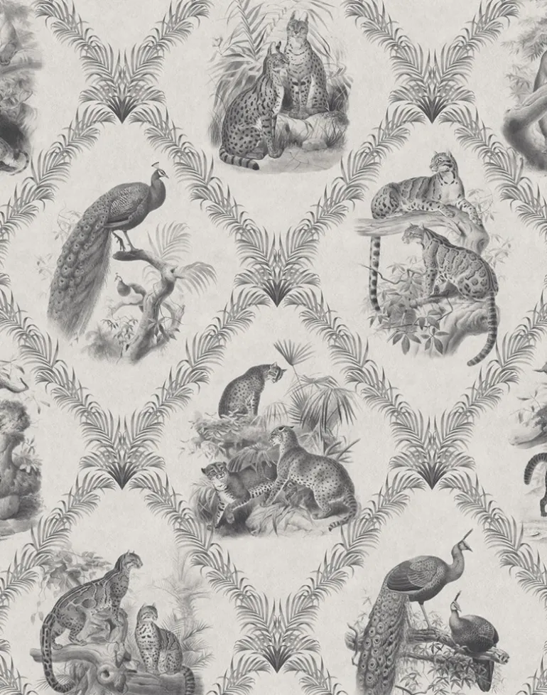 Original illustrations from the archives of London’s Natural History Museum showcase fierce cats and fabulous peacocks for a wallpaper that brings the wonder of nature to your home.