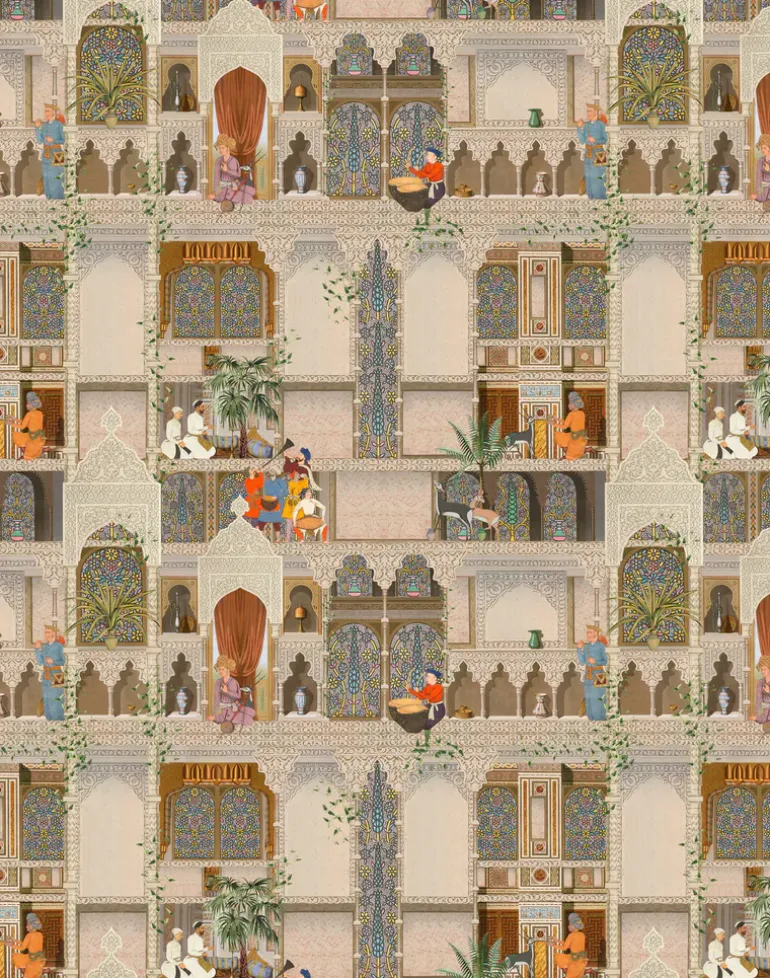 Illustrating the ornamental beauty of Arabic citadels and fortresses, THE KASBAH print is filled with intricate depictions of architectural motifs and decorative stained-glass windows. Residents gather to create music as the sound of traditional instruments echo exquisitely across the courtyards of these magical buildings. Bursts of color from architectural details and flamboyant dress complement the natural hues of the walls and columns resulting in a balanced ambience which radiates into the home.