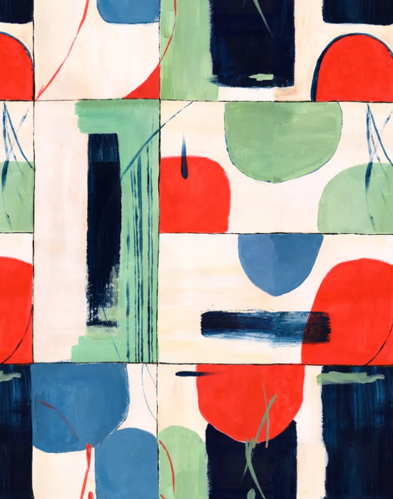 THE VISION is an abstract geometric hand-painted artwork rescaled at the size of a mural wallpaper. Made on 3 rolls, THE VISION is presenting a spectacular large geometric pattern with irregular shapes overlaid in a creative game.