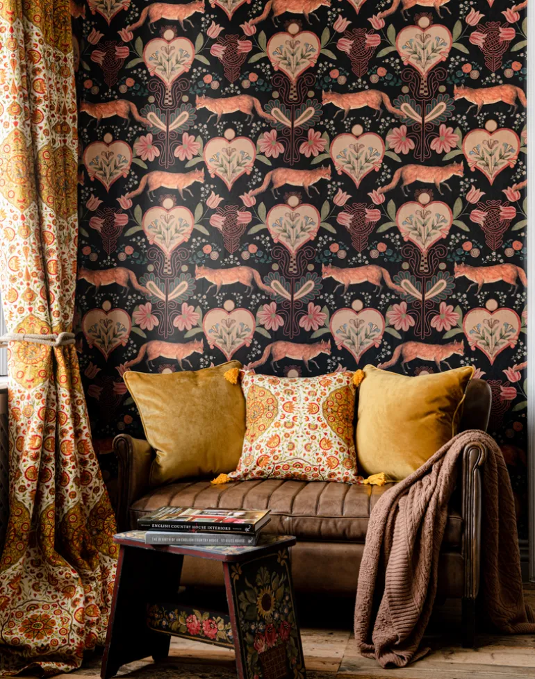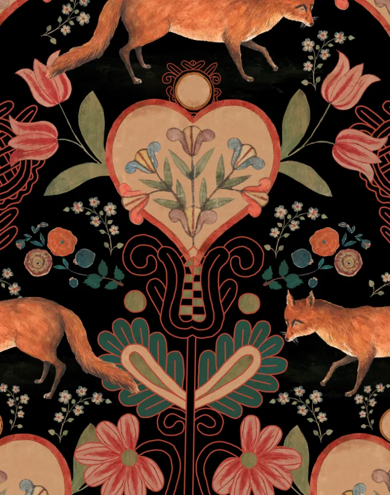 Depicting witty details of Carpathian wildlife, THE VIXEN is emblematic for our ancestors’ hunting habits as well as for traditional mirrored patterns. Bold and charming, the red fox stands out in a soothing flowery décor. Available on anthracite or taupe background.