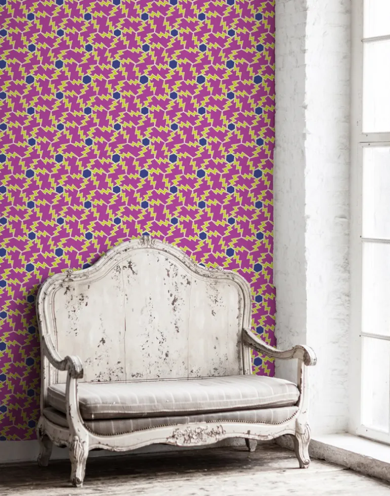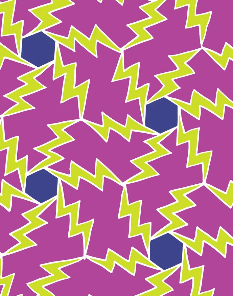 Designed together, Thunder and Lightning were born from Merenda’s drawing of dancing lightning bolts and playful hexagons. Thunder portrays a more classic geometric pattern, while Lightning features larger bolts in a true superhero style.