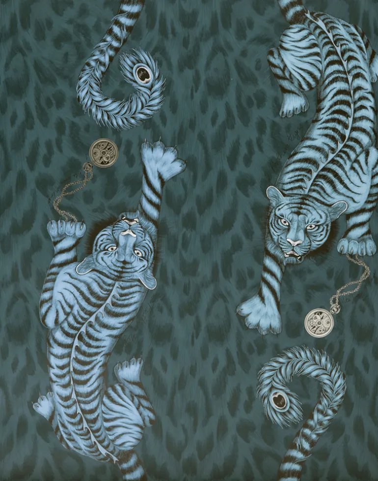 The Tigris Wallpaper is part of our magical Animalia collaboration with interior experts Clarke & Clarke. This design features a striking tiger inspired by classical Greek and Roman mythology, and in true EJS style, the design exhibits an intricate twist – a uniquely placed peacock tail and clockwork details. Channel the intensity of the jungle with the rich navy Tigris Wallpaper, featuring vivid, deep navy with a contrasting light blue; an enchanting combination brought together with shimmering metallic details.