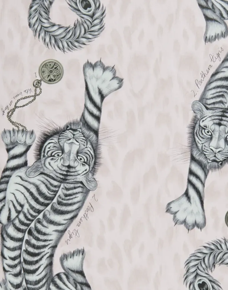 The Tigris Wallpaper is part of our magical Animalia collaboration with interior experts Clarke & Clarke. This design features a striking tiger inspired by classical Greek and Roman mythology, and in true EJS style, the design exhibits an intricate twist – a uniquely placed peacock tail and clockwork details. Channel the intensity of the jungle with the rich navy Tigris Wallpaper, featuring vivid, deep navy with a contrasting light blue; an enchanting combination brought together with shimmering metallic details.