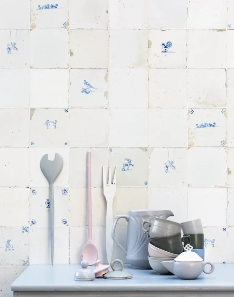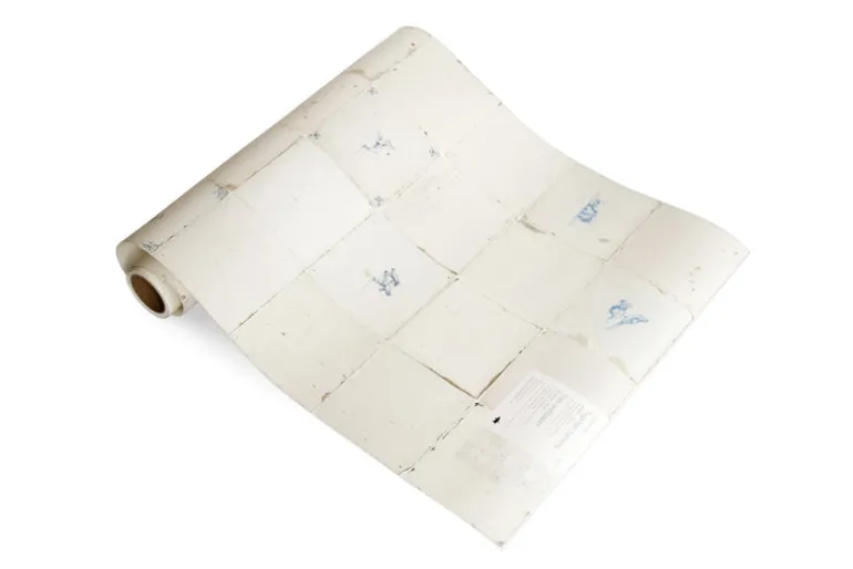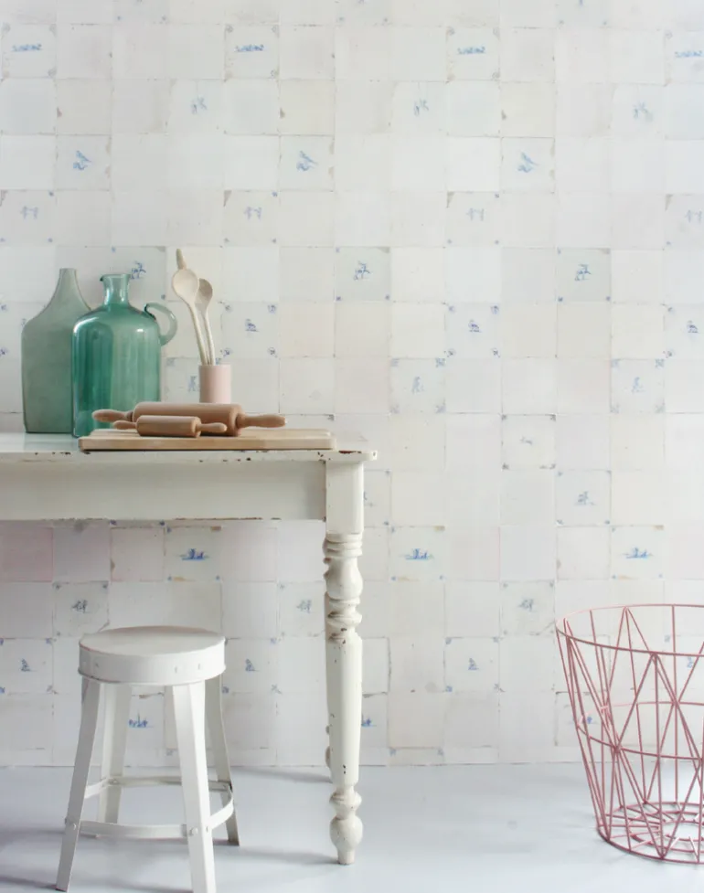 The tiles wallpaper provides a beautifully light decoration of antique tiles for your wall. It is a balanced mix of worn white Frisian tiles and old Dutch blue tiles. Picturesque farmer landscapes, children’s games, birds and farm animals spark your imagination. The wallpaper brings a touch of the 17th century back in the interior.