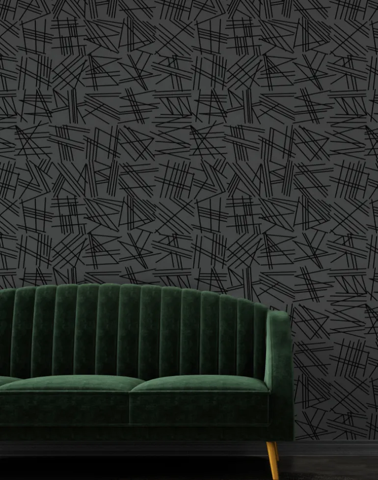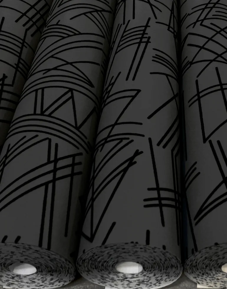 A black flock geometric wallpaper on a heavy weight semi-fibrous dark grey ground