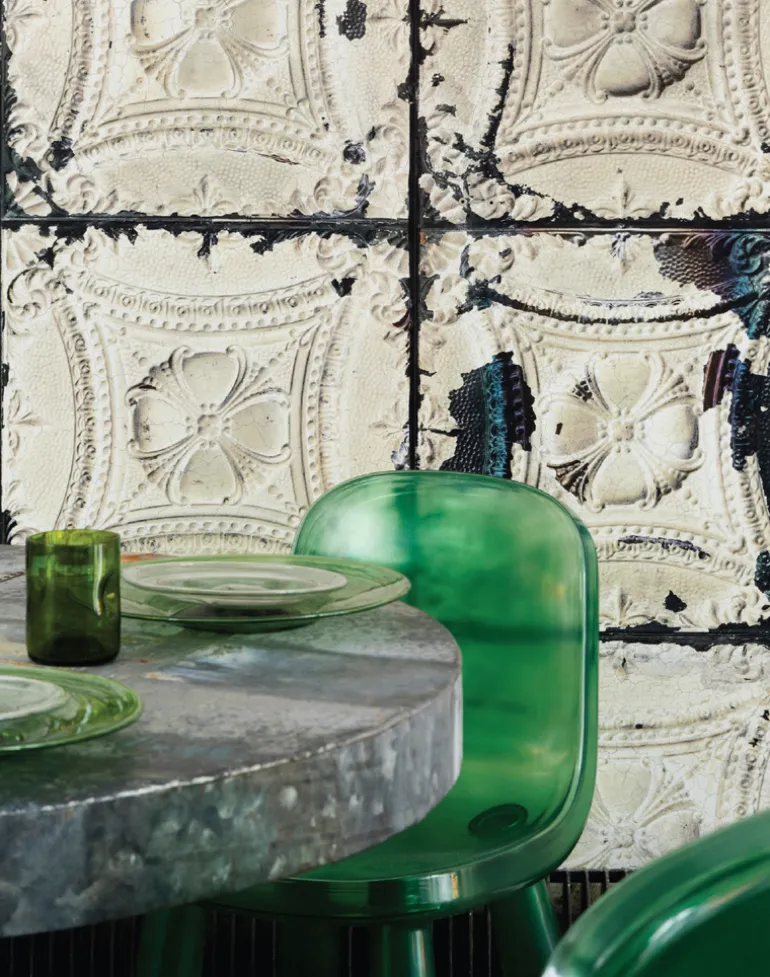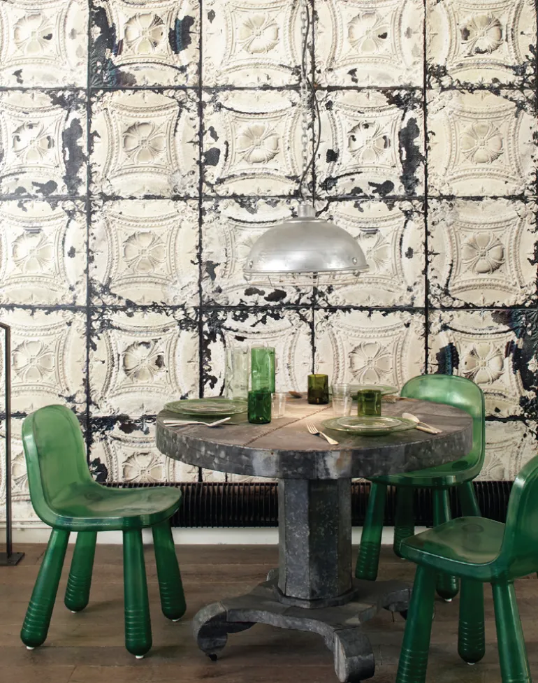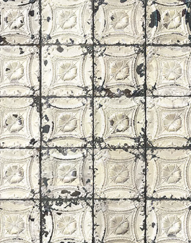 Historically, tin ceillings were introduced to North America as an affordable alternative to the exquisite plaster work used in European homes. It was between 1890 and 1930 that thin rolled tin-plates were being mass-produced. Tin ceilings were traditionally painted white to give the appearance of hand- carved or molded plaster. But, today the irregularity and the aging give all the appeal to this American architecture icon.