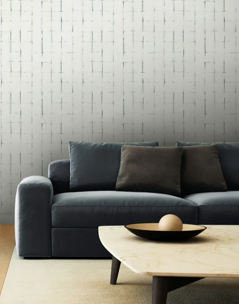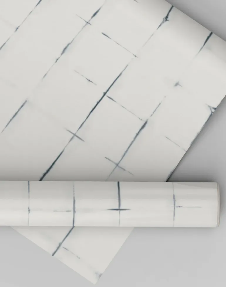 Using the traditional Shibori method of shaped-resist dyeing, fabric is folded and tightly clamped, intentionally allowing only trace amounts of dye to seep into the exposed cloth. The resulting pattern is a dissipating grid with delicate intricacies.