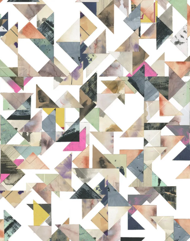 Trade Routes is a guest appearance by Max Kahan, artist, wallpaper hanger and Merenda’s life partner. Kahan worked with treated paper in a consistent triangle shape to create a free-flowing map that reflects the need to both back off and bear down when finding the path of balance in life. The interplay of precision, randomness, structure and fluidity is expressed in this colorful and mesmerizing wallpaper designed from original artwork by Kahan.