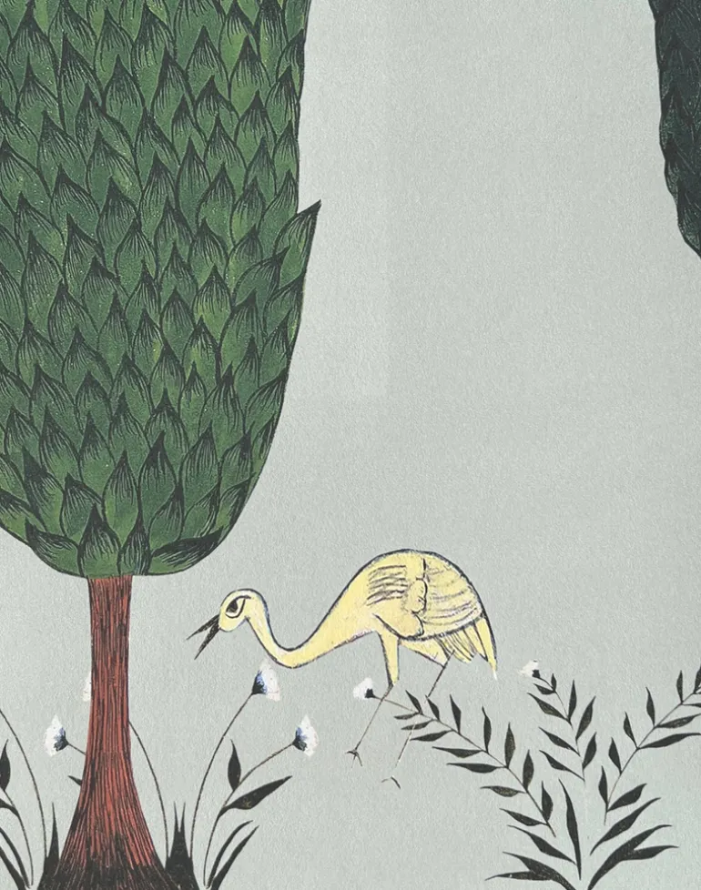 Immerse yourself into the magnificence of the cypress trees and migratory cranes, intricately painted Tranquility design by Shweta using heritage painting techniques creating a tranquil ambience.