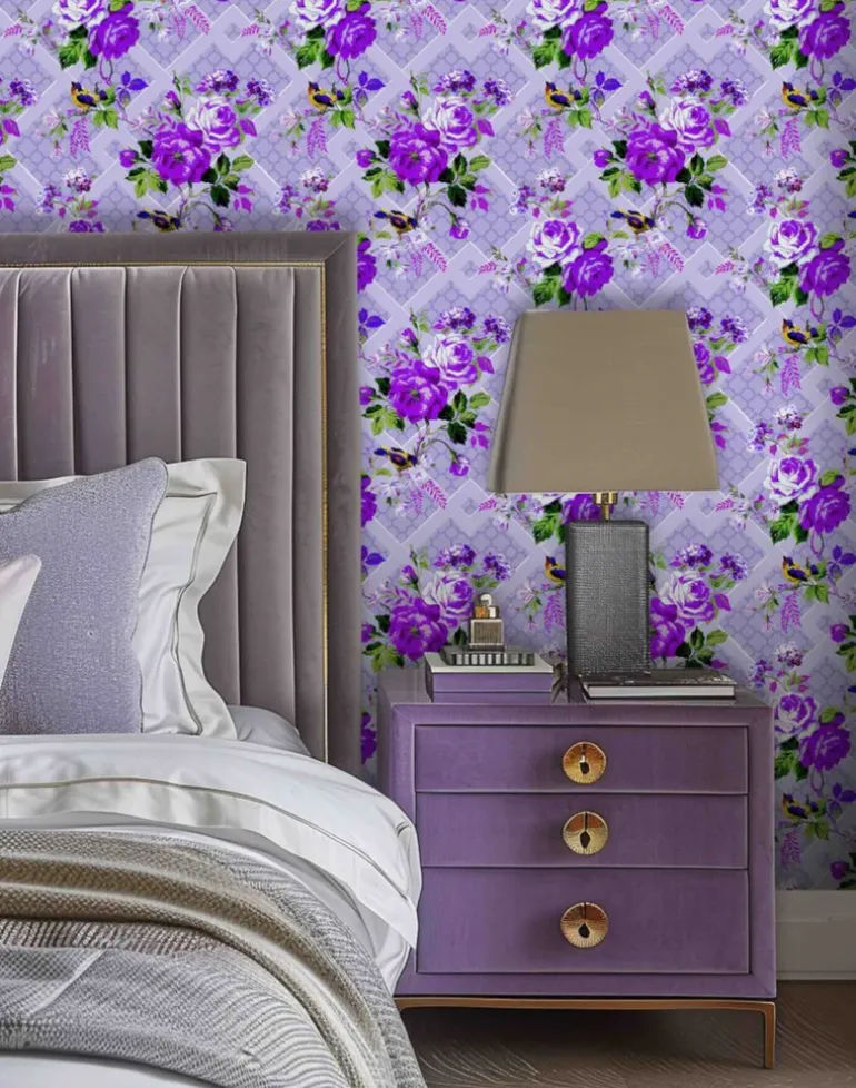 Trellis Garden luxury maximalist wallpaper features a geometric trellis pattern adorned with tropical birds and beautiful roses in soft pastel shades. It transforms any space into maximalist luxury. Perfect to add some color and pattern to a lounge or bathroom but it will add vibrancy and sophistication to any space.