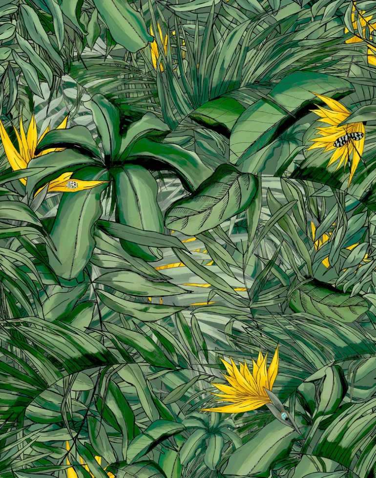 A tranquil view of jungle foliage, calming the mind as we gaze upon the vibrant leaves, flowers and insects deep within the tropical forest created beautifully by Brand McKenzie.