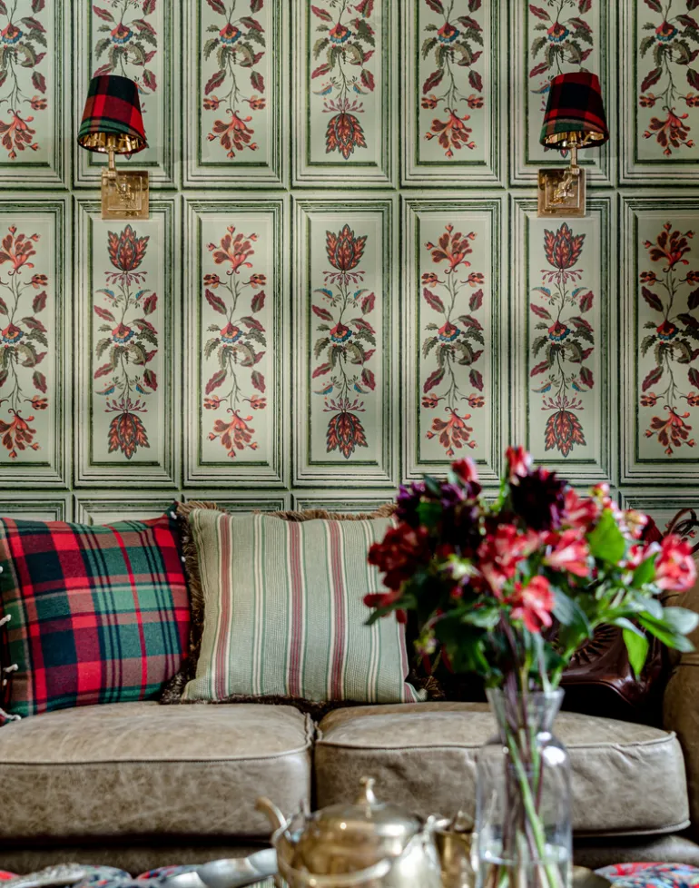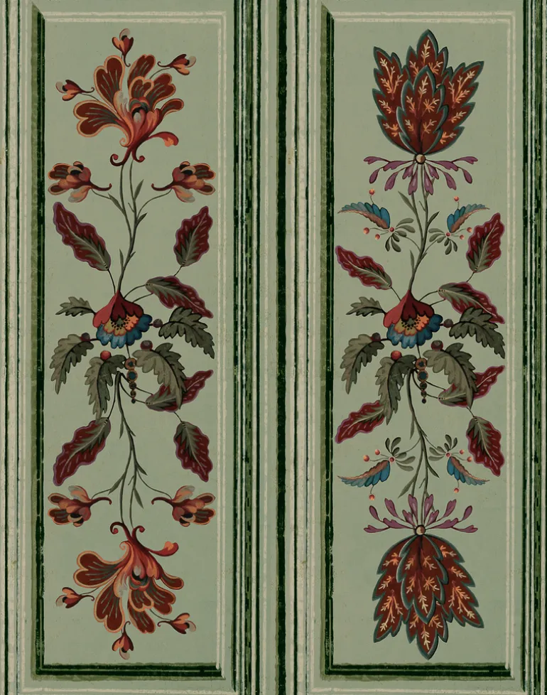 With its painterly strokes and folkloric inspired elements, this trompe l’oeil paper is designed to create the look of traditional Tyrolean panels to be found painted on furniture or even on the house walls. Available in taupe, alpen green and dramatic black, the fiery, stylized blooms and delicate leaves are framed by a convincing panel-like border creating a beautiful whimsy wallpaper.