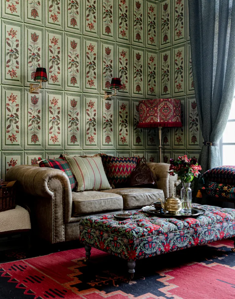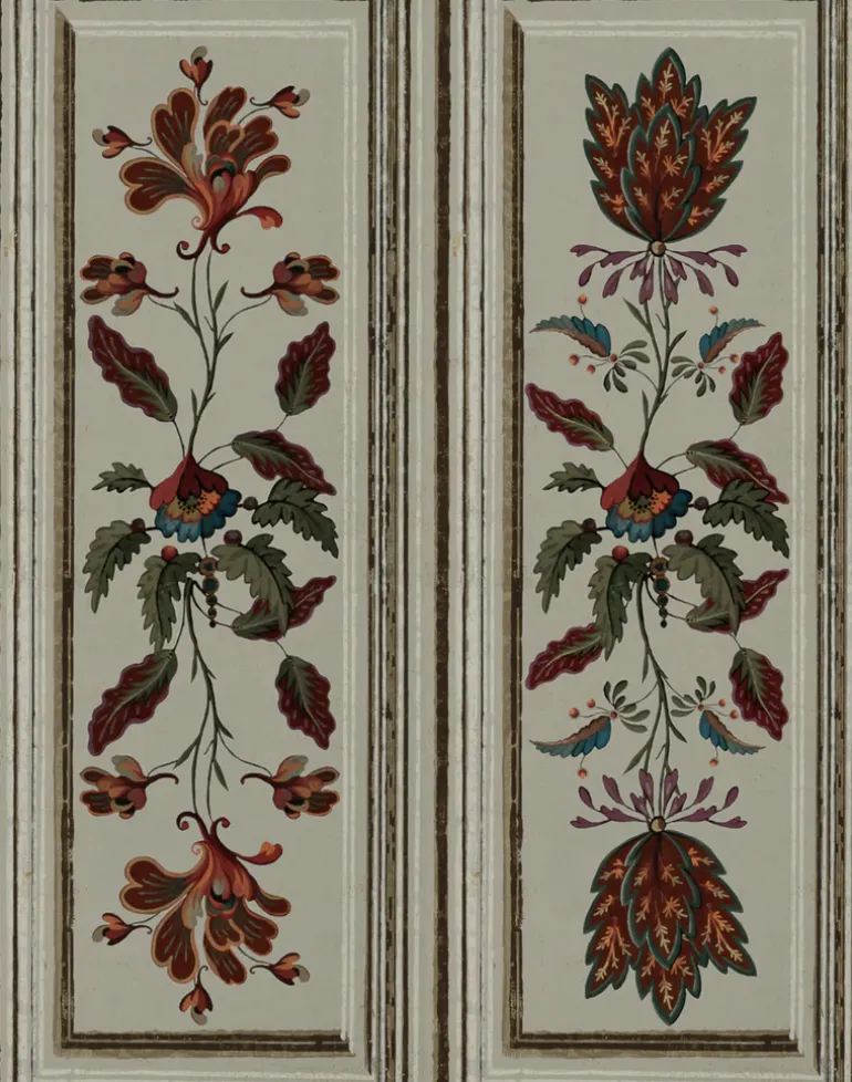 With its painterly strokes and folkloric inspired elements, this trompe l’oeil paper is designed to create the look of traditional Tyrolean panels to be found painted on furniture or even on the house walls. Available in taupe, alpen green and dramatic black, the fiery, stylized blooms and delicate leaves are framed by a convincing panel-like border creating a beautiful whimsy wallpaper.