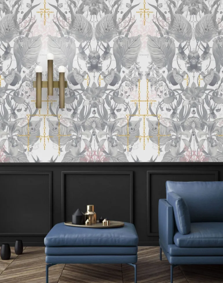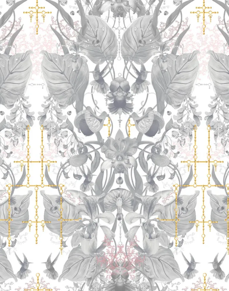 Ultraviolet Garden illuminates the hidden and strange realities of the natural world. The scene explodes with vitality, as an abundance of highly ornamental flora and fauna are latticed with a fragile framework of precious metal chains. The grand and highly lyrical pattern mimics the composition and intricacy of the orchid, creating a visual language that revels in the unfathomable, ever-evolving complexity of nature. One of our most iconic designs, the vastness of this wondrous scene injects drama, opulence and dimension into space.