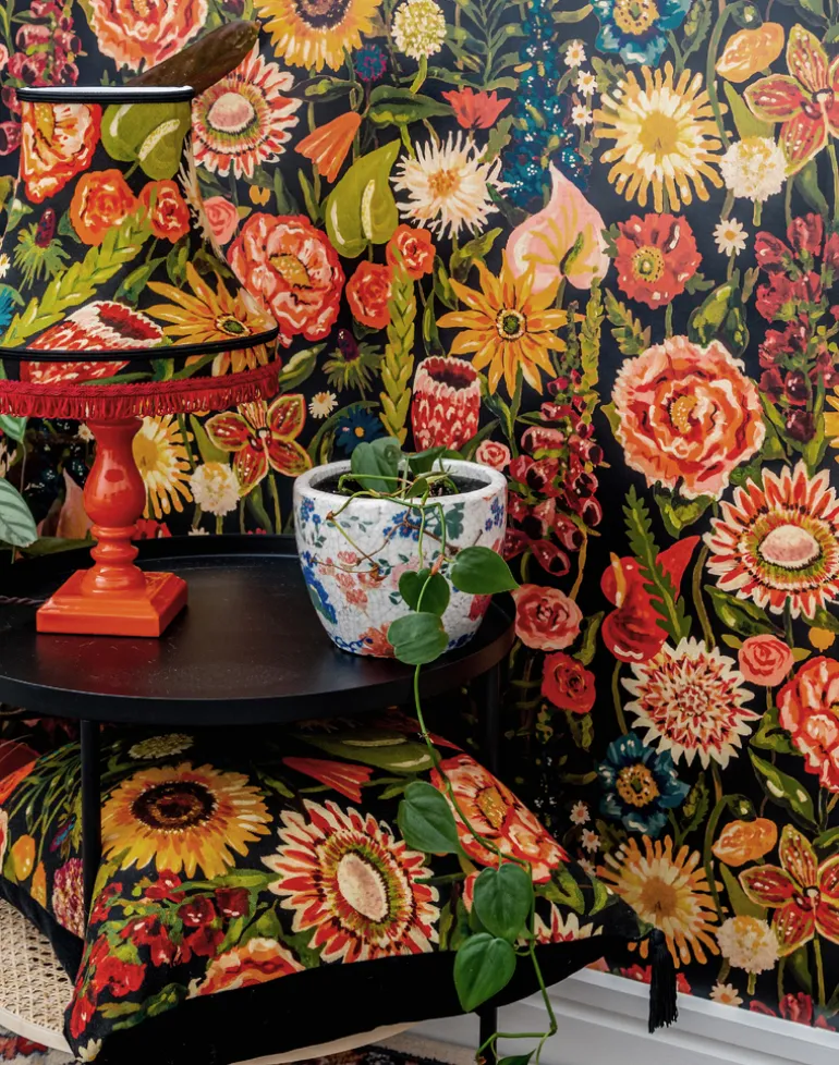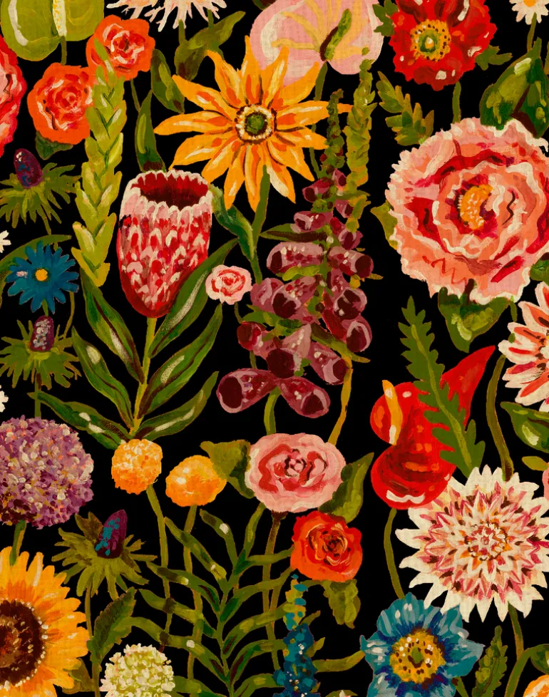 Our stunning print Utopia depicts a painterly meadow of gorgeous vibrant and blooming florals. Titled ‘Utopia’ it evokes an imagined state in which everything is perfect. Featuring sunflowers, foxgloves, poppies, peonies and orchids! The Jet- black colorway showcases rich and harmonious primary color palette including olive greens, letter box reds and golden yellows. Create a dark and alluring romantic vibe using this stunning print and colorway.