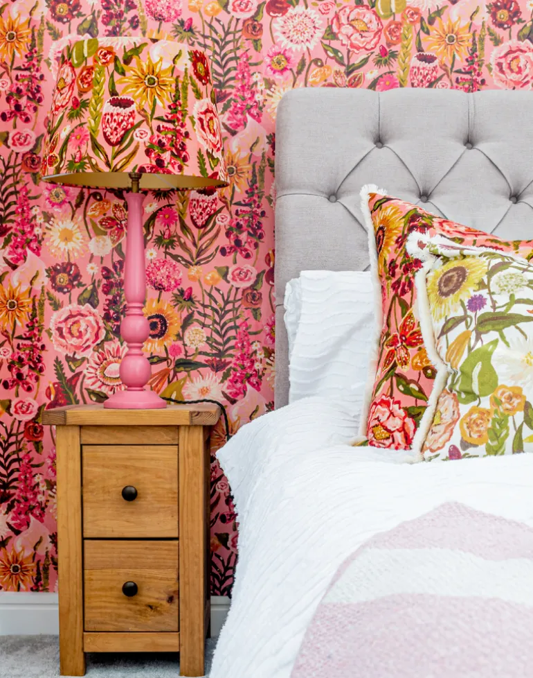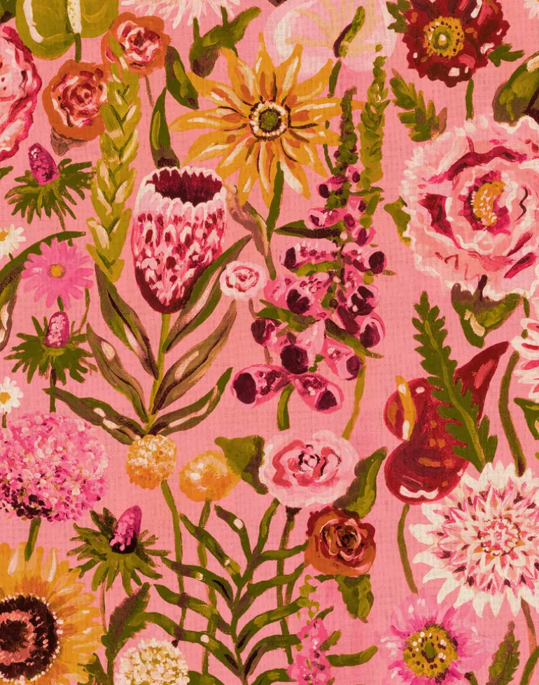 Our stunning print Utopia depicts a painterly meadow of gorgeous vibrant blooms. Titled ‘Utopia’ it evokes an imagined state in which everything is perfect. Featuring and entanglement of sunflowers, foxgloves, poppies, peonies and orchids! The Rosa-Pink colorway showcases a feminine palette of pinks, vermillion and olive green. Create a warm and calming vibe using this intimate, feminine and charming colorway.