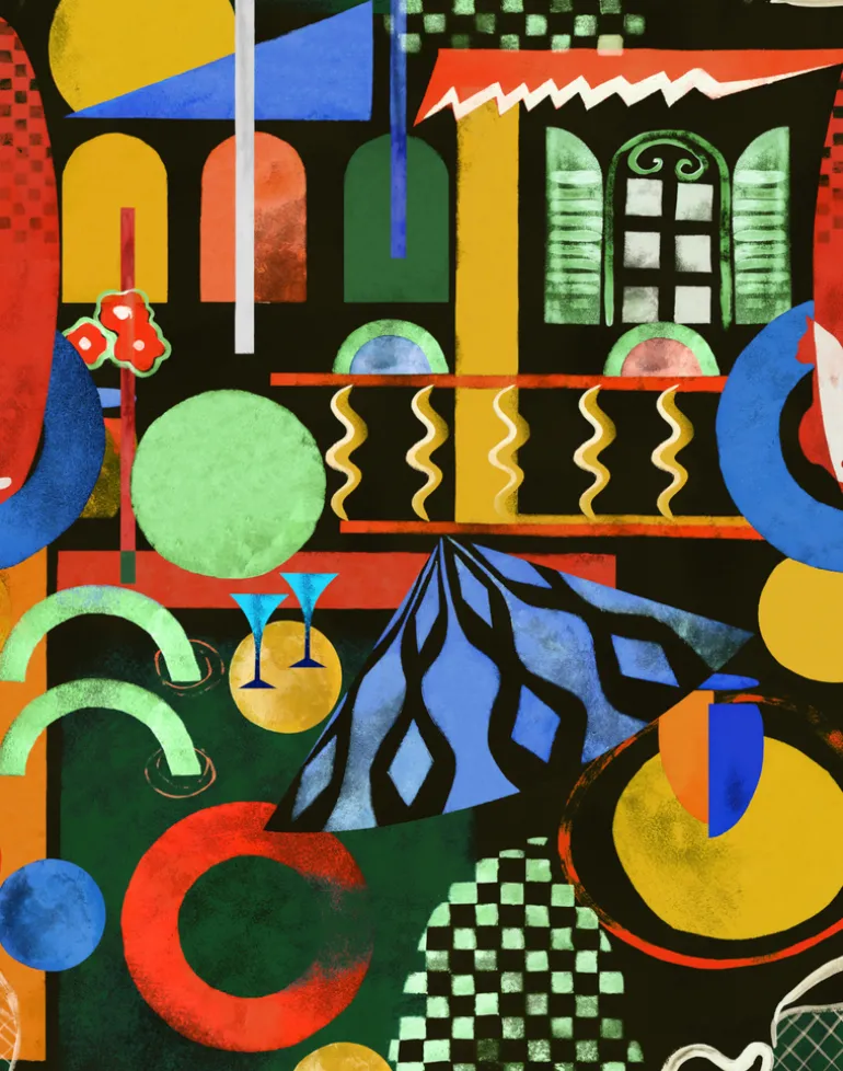 A sun-drenched veranda, awaken by a charming Italian breeze through whimsical windows that frame the picturesque landscape beyond. From the earthy tones of terracotta to the azure depths of the Mediterranean sky, each hue resonates with the joyous spirit of conviviality and relaxation. Amidst the intricate geometrical motifs, charming vignettes of leisurely indulgence are waiting to be discovered — a glass of chilled limoncello, a bowl of ripe figs, an illuminated corner beckoning you to linger a while longer. Let your eyes envision tales of lazy afternoons with this modern style design, an ode to languid conversations and cherished moments bathed in the soft glow of twilight. Available also on a moody deep background.
