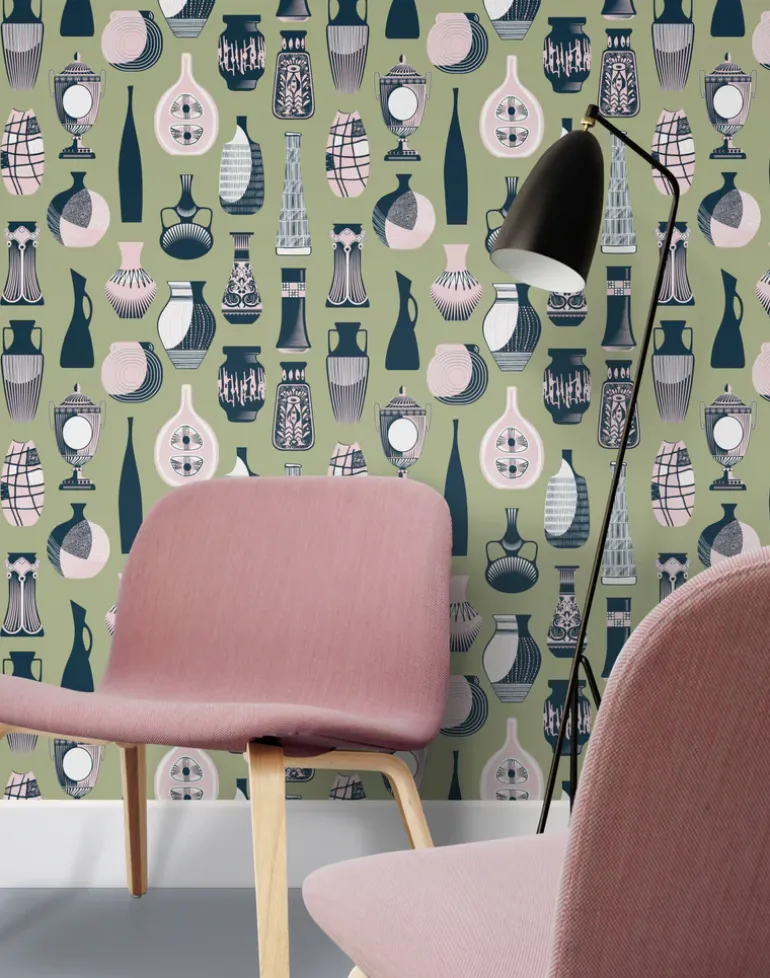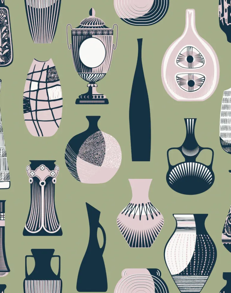An eclectic array of vases and jugs adorns this wallpaper, inspired by the Geffrye’s diverse ceramics collection.
